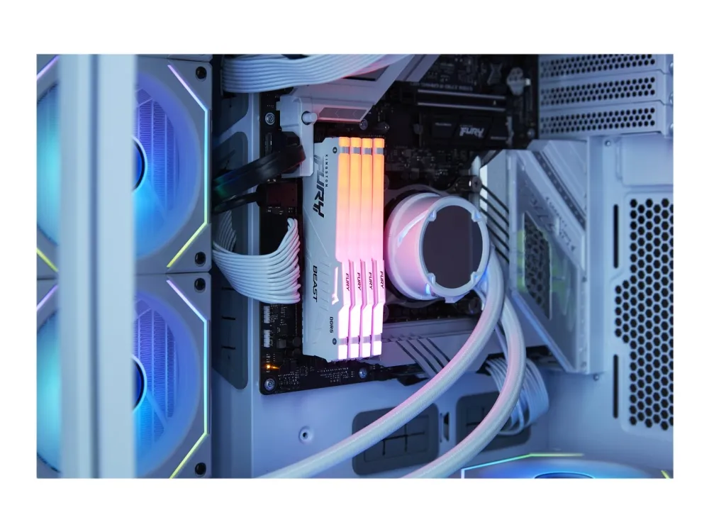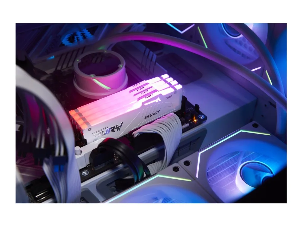 Kingston FURY Beast RGB tarjoaa lisää suorituskykyä ja tyyliä suurilla nopeuksilla, aggressiivisella muotoilulla ja RGB-valaistuksella, joka kulkee moduulin pituussuunnassa tasaisia ja upeita tehosteita varten. Siinä on Plug-and-Play-automaattinen ylikellotus suurilla nopeuksilla, ja se on sekä Intel XMP -valmis että valmis AMD Ryzenille. FURY Beast RGB pysyy viileänä tyylikkään, matalaprofiilisen lämmönjakajan ansiosta.