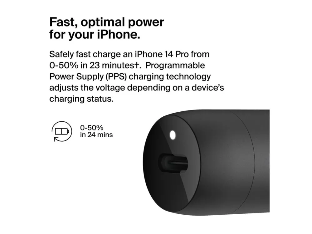 Get more out of your commute with the compact and powerful BoostCharge 30 W USB-C Car Charger. Fast charge an iPhone from 0-50% in 23 minutes† with the included USB-C cable with Lightning connector. The PPS technology automatically adjusts the wattage based on your connected device.