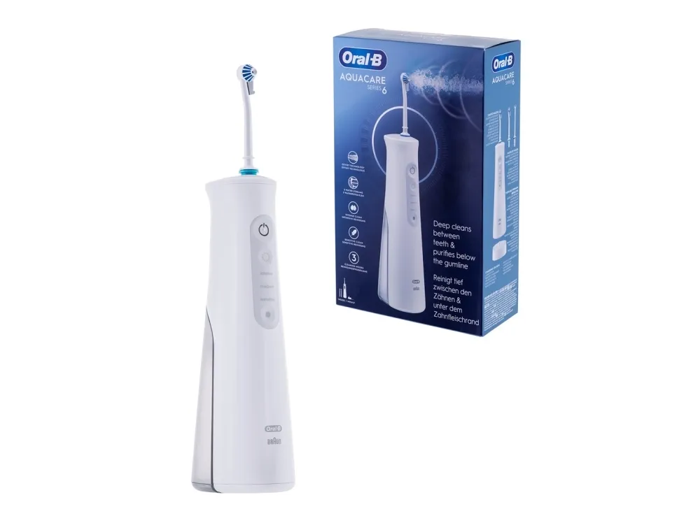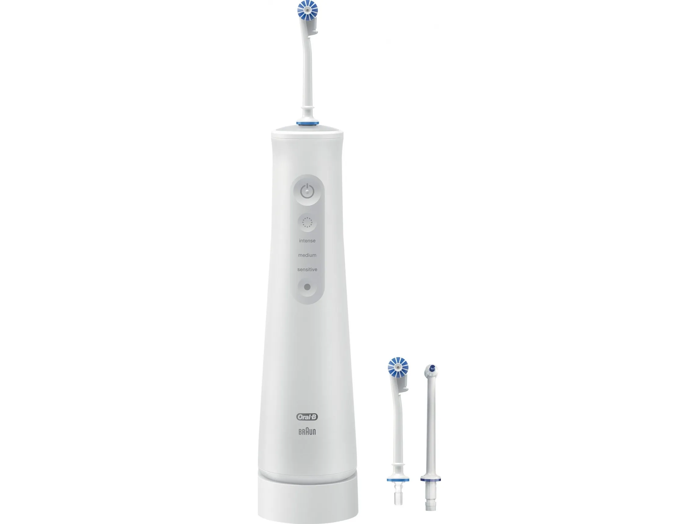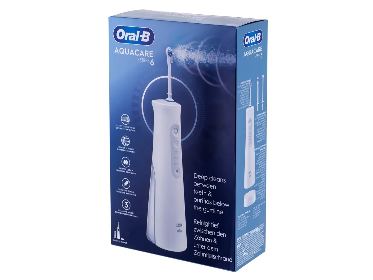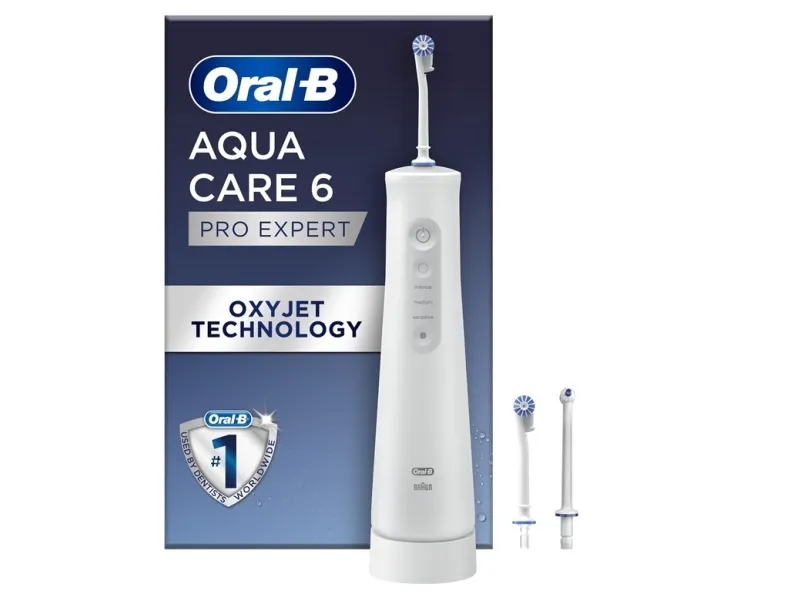 Boost your oral care routine with the Oral-B Aquacare Pro-Expert irrigator, featuring Oxyjet Technology for invigorating gum care.- Oxyjet Technology: water enriched with microbubbles boost cleaning action- On-demand mode: pulse setting for a precise clean- 3 intensities: customise your clean with intense, medium or sensitive water pressures- 2 streams: choose a focused or rotational water stream for gentle interdental clean- Cordless: easily handled with no attachments- Protect dental work: gently remove food trapped between wires and bracesWhy use Oral-B’s Aqua Care?Interdental cleaning promotes optimal gum health.Why Oxyjet Technology?Oral-B’s Oxyjet Technology mixes air and water to form clean-boosting microbubbles.What is On-Demand mode?The On-Demand mode allows you greater control of the stream to release water only when you need it.What are the advantages of handheld?Single-body handheld unit improves portability, while the rear-configuration water reservoir allows for easy access and refilling.How to use the Oral-B Aqua Care?To use, aim at interdental spaces and along the gum line, targeting left behind debris.When to use the Oral-B Aqua Care?Use before or after brushing to remove leftover food particles for optimal oral hygiene.What if I have braces or implants?Braces and implants trap food. Oral-B’s Aqua Care carefully cleans these problem areas.What if I have sensitive teeth?Customise your clean with three cleaning intensities, including one specifically for sensitive teeth.Oral-B Aquacare 6. Power source: Battery. Number of heads: 2 head(s)