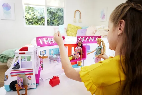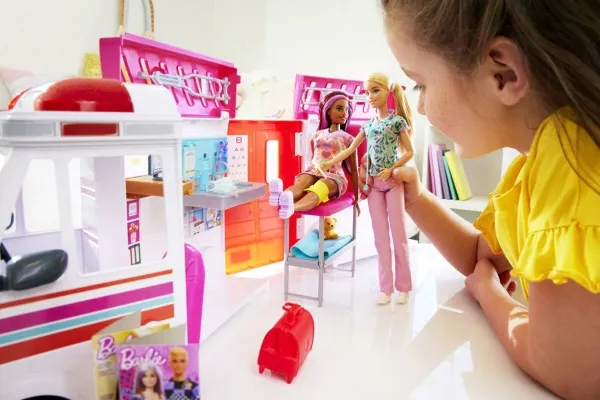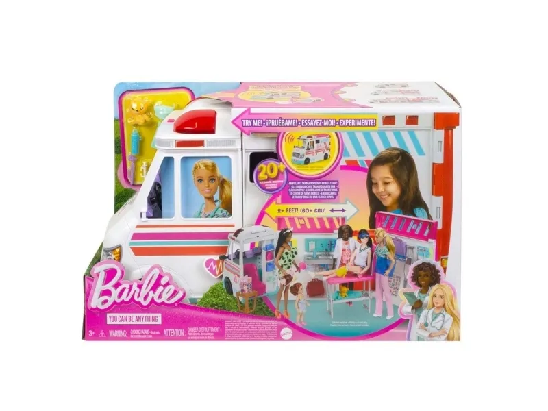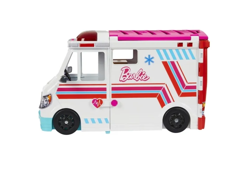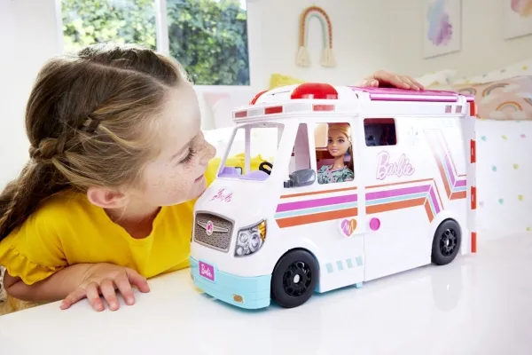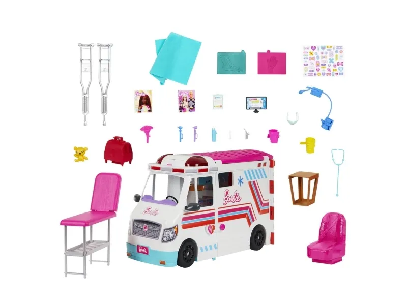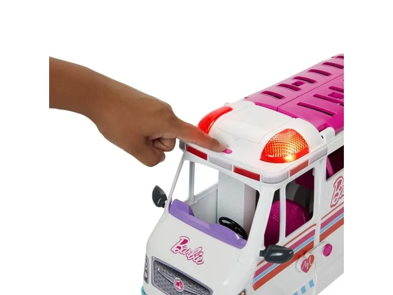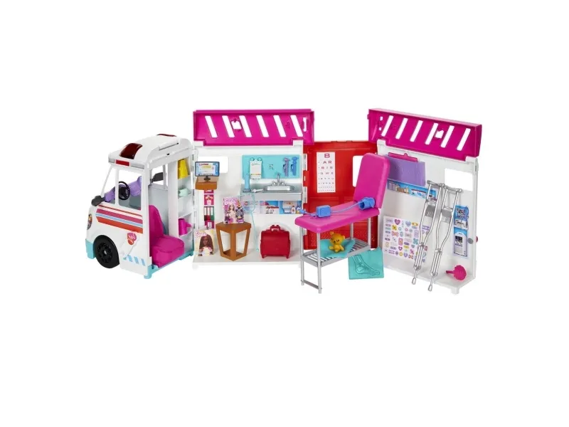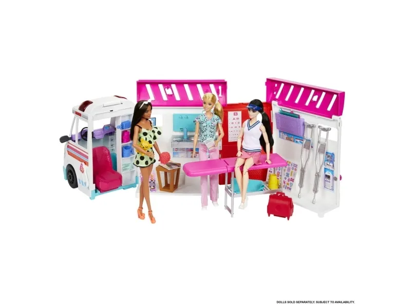 ​The Barbie® Care Clinic playset lets kids explore their nurturing side as a care clinic medical professional. The Care Clinic vehicle transforms from an ambulance, complete with lights and sounds, into a doctor's office with an exam room and exam table, check-in area and waiting room. More than 20 accessories inspire imaginations to care for patients and play out nurturing stories. Doll not included. Colors and decorations may vary.
