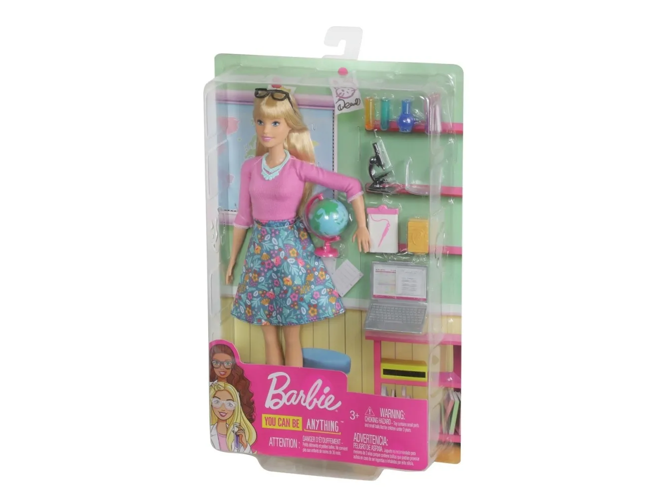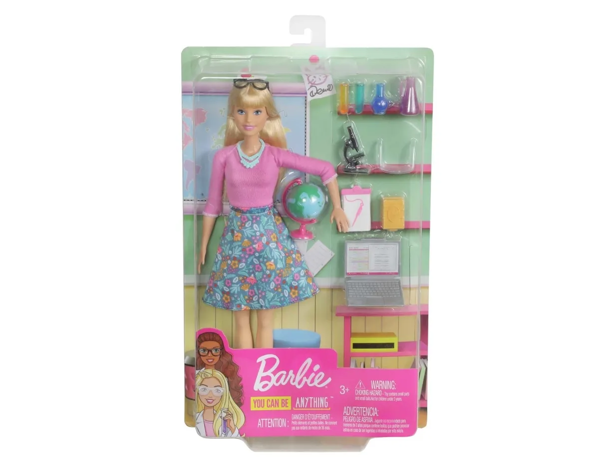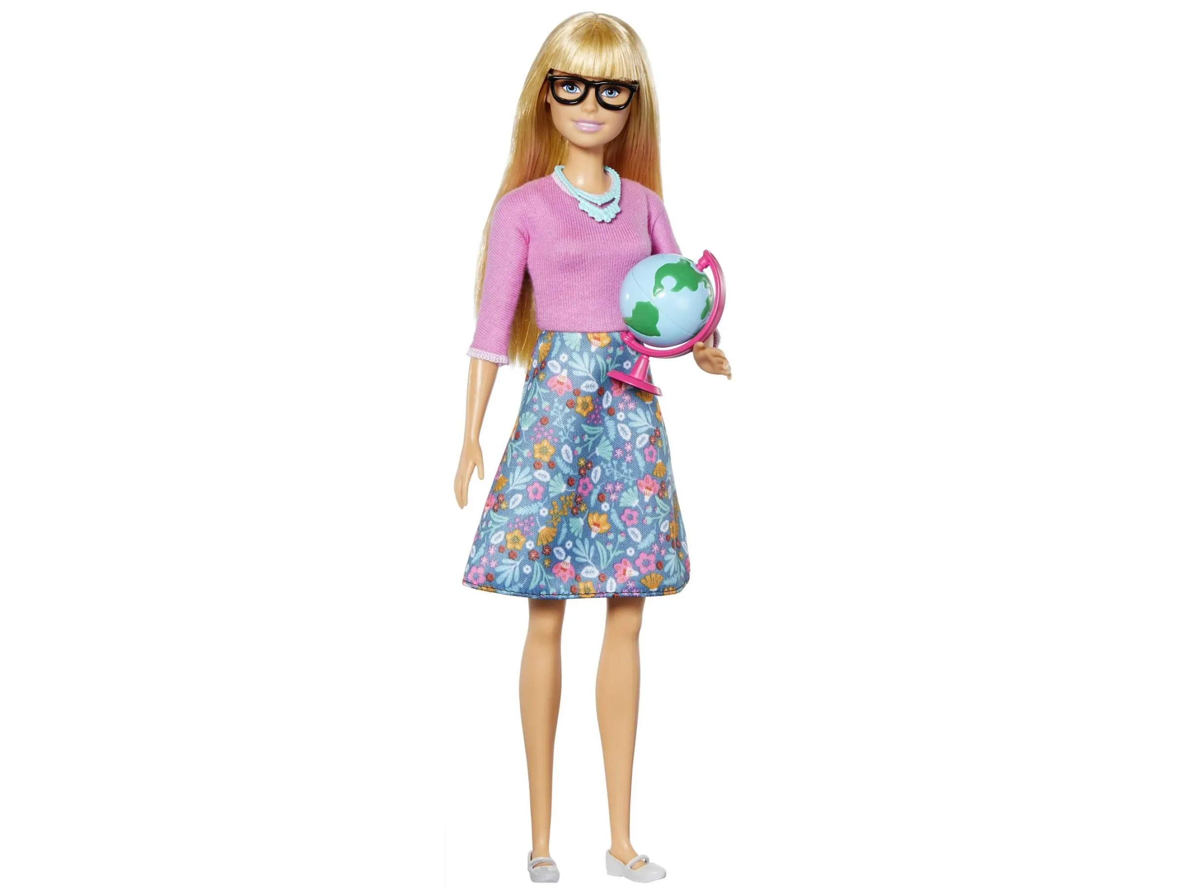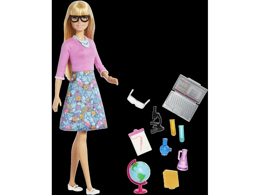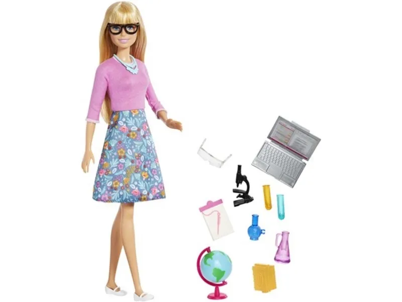 Barbie teacher doll helps her students make the grade with 10 teaching accessories! Explore geography with the spinning globe. Study biology with the microscope. Mix it up in chemistry with two flasks and two beakers. Then record, study and grade it all with the clipboard, book and laptop that opens and closes. Barbie doll heads the class wearing an outfit that can be accessorized with her glasses or goggles. Explore all the Barbie career dolls and toys to open the door to endless possibilities because when a girl plays with Barbie, she imagines everything she can become (each sold separately, subject to availability). Includes Barbie doll wearing fashion and shoes, plus 10 school-themed accessories. Doll cannot stand alone. Colours and decorations may vary.Barbie Doll. Doll type: Fashion doll, Doll's gender: Female, Recommended age (min): 3 yr(s), Suggested gender: Boy/Girl. Height: 330.2 mm, Weight: 120 g. Material: Fabric, Plastic, Product colour: Multicolour