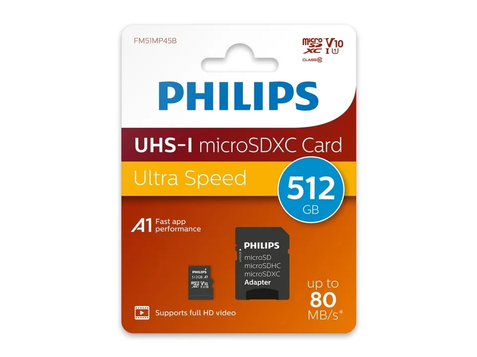 Wide Compatibility: Compatible with a wide range of devices, including smartphones, tablets, digital cameras, drones, and more, the Philips Micro SDXC UHS-I U3 memory card offers maximum flexibility and ease of use. Whether you’re on the go or working in the studio, you can rely on this memory card to seamlessly integrate with all your favorite devices.Philips FM51MP65B/00. Capacity: 512 GB, Flash card type: MicroSDHC, Flash memory class: Class 10, Internal memory type: UHS-I, Read speed: 100 MB/s, Write speed: 80 MB/s, UHS Speed Class: Class 3 (U3), Video Speed Class: V30. Product colour: Black