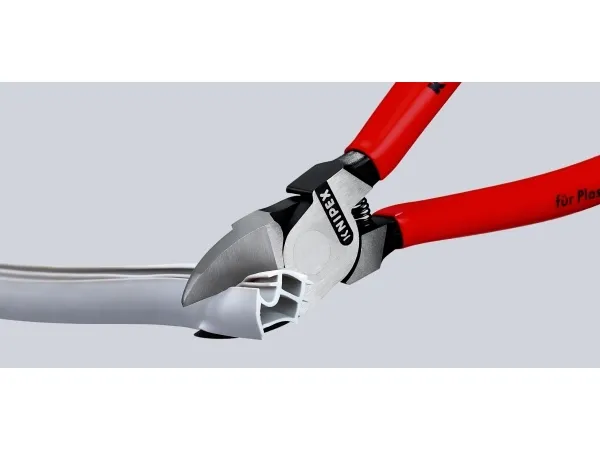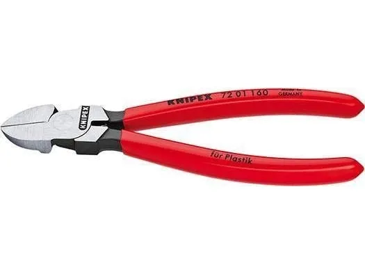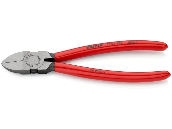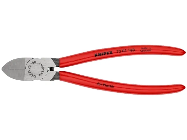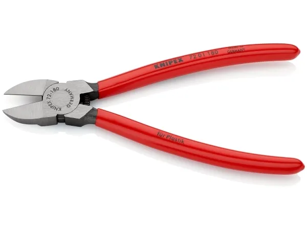 - cutting face flush ground- for nearly flush cutting of moulded plastic components from sprues- cuts soft materials such as lead in a flush cut- with opening spring- Vanadium electric steel; forged, oil-hardenedKnipex 72 01 180. Type: Diagonal pliers, Material: Chromium-vanadium steel, Handle material: Plastic. Length: 180 mm, Weight: 193 g