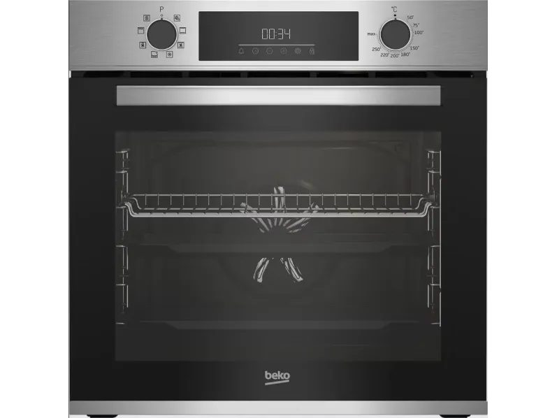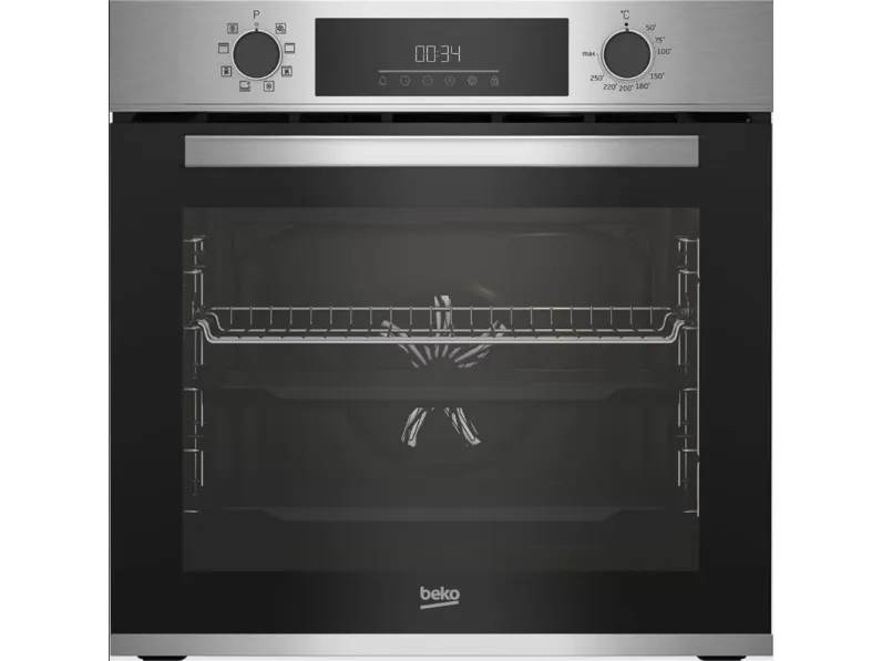 Brand- Beko. Model- BBIM12300XD. Width- 59.4 cm. Depth- 56.7 cm. Height- 59.5 cm. Colour- Black, Silver. Weight- 28.7 kg. Material housing- Stainless steel. Energy Efficiency Class- A. Power- 2600 W. Oven type- Electric. Oven capacity- 72 l. Maximum oven temperature- 250 °C. Number of oven functions- 8. Oven functions- DefrostingConvectionTraditional baking3D bakingElectric grillThermal circulation with an oval heaterSmall grill + convectionSteam cleaningUnderfloor heating. With lighting- Yes. Thermostat- No. Cleaning type- Steam cleaning. Screen- Yes. Timer- Yes. Control- Mechanical. Number of baking trays- 1. Child safety function- No. Number of grids- 1. Mandatory warranty- 24 mo.