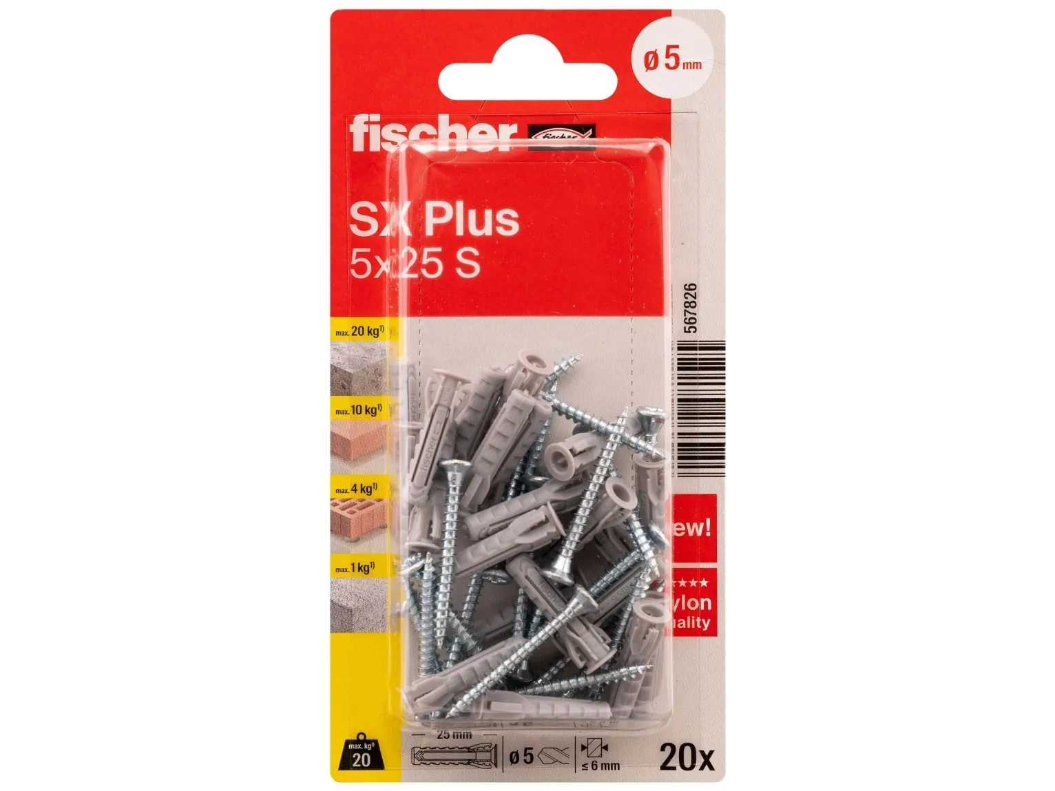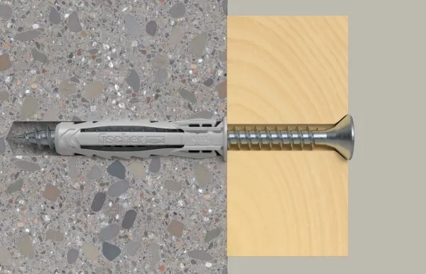 Thanks to its 4-way expansion, the fischer SX Plus expansion plug is the specialist for solid building materials such as concrete, sand-lime brick and masonry. The special fixing blades ensure pre-fixation of the screw, which means that it does not have to be additionally held in place for overhead applications. This screw fixation allows the user a flexible and comfortable setting process. The flexibel plug edge also prevents the plug from slipping deeper into the drill hole for secure installation. The screws supplied are optimally matched to the fischer SX Plus expansion plug. The high-quality nylon material guarantees a permanently secure hold in a wide range of solid and perforated building materials.Fischer SXPlus5x25SK VE20 Dübel SX Plus. Quantity per pack: 20 pc(s)