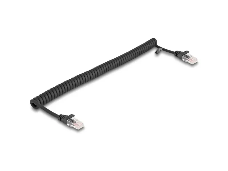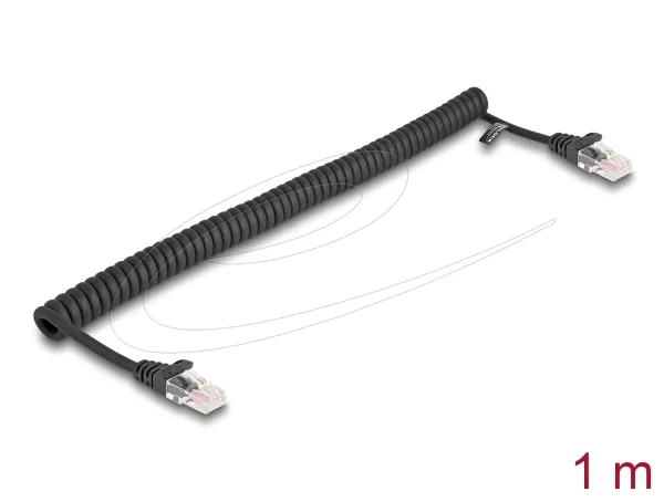 Coiled Cable The coiled cable enables flexible data transfer, is easy to store and unlike conventional cables, takes up less space. It also has a high restoring force and can be extended to three times its original length.DeLOCK RJ45 Coiled Cable male to male Cat.5e 1 m black. Cable length: 1 m, Cable standard: Cat5e, Connector 1: RJ-45, Connector 2: RJ-45, Product colour: Black