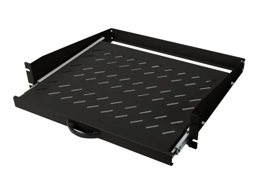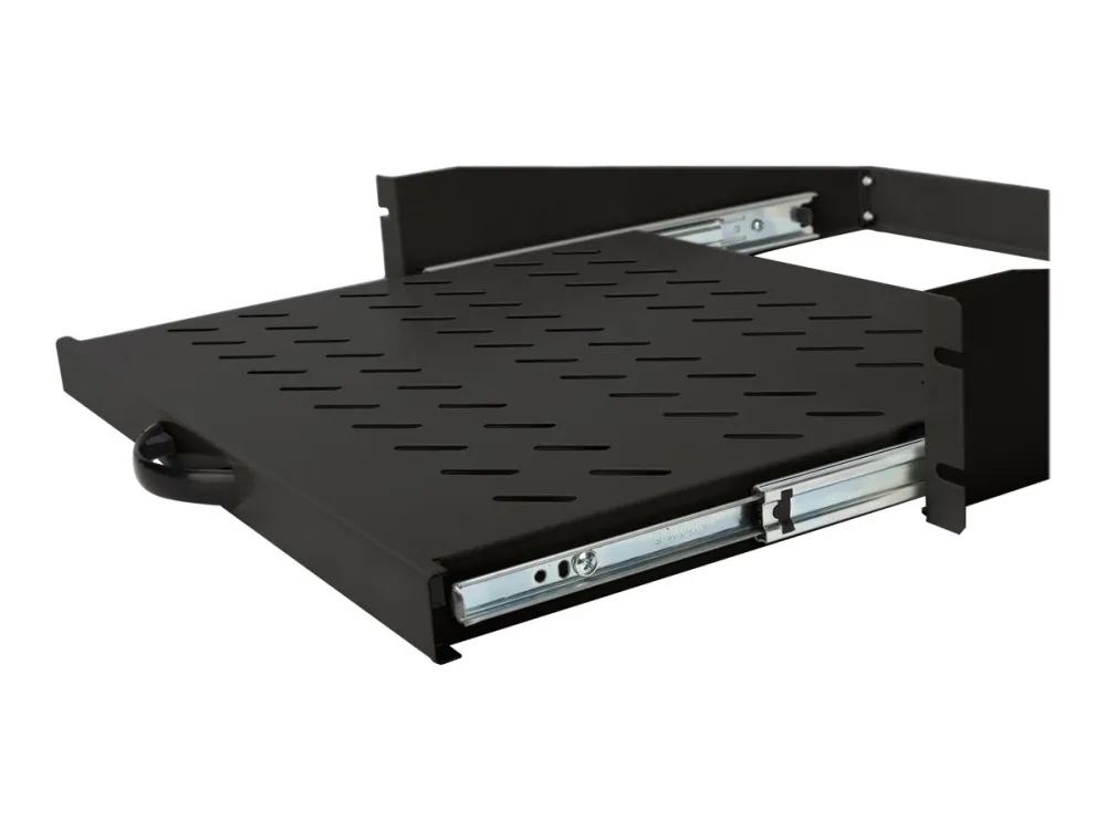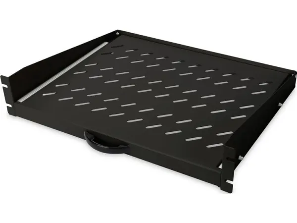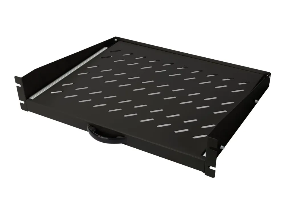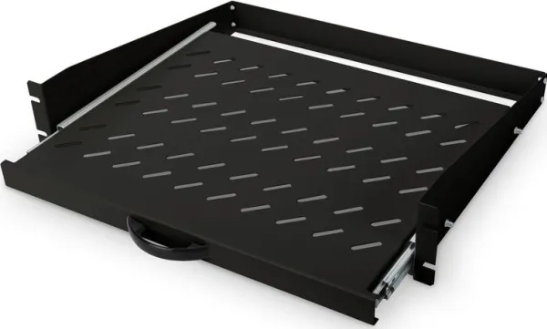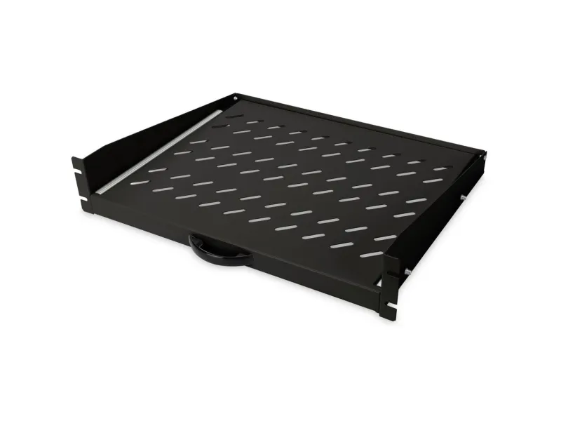 The shelf for fixed mounting is easy to install on the front 483 mm (19“) profile rails of your 483 mm (19“) network- or server cabinet. Due to its compact construction it is perfectly suitable also for 483 mm (19”) wall mounting cabinets with a depth from 450 mm. The shelf is extendible via handle which makes the access easier. Due to its stable, perforated steel sheet with a load capacity of 30 kg, it is the optimal surface for components which are not 483 mm (19”) suitable.