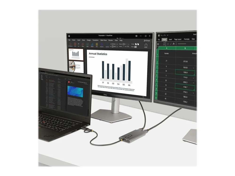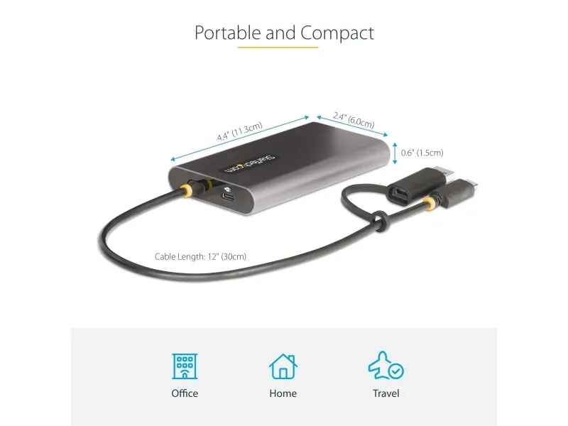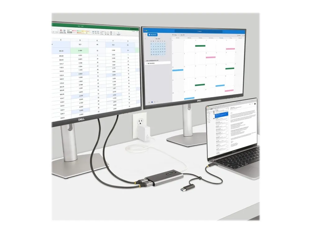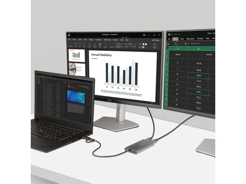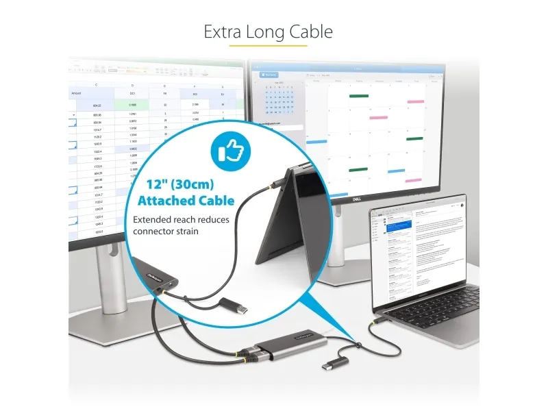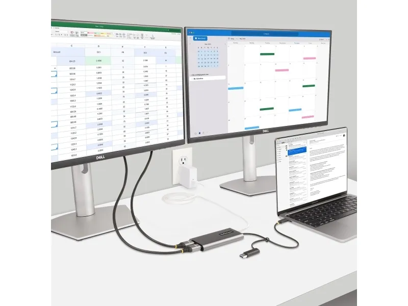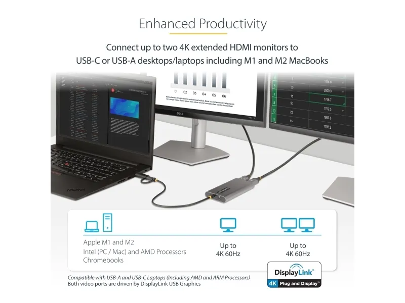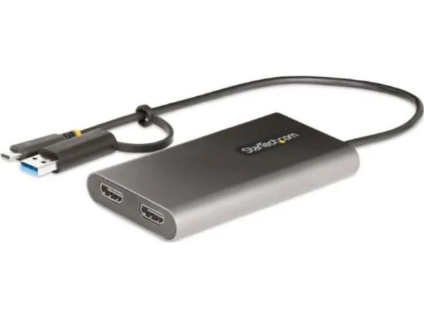 Connect two 4K 60 Hz HDMI displays to the USB Type-C or Type-A port of a laptop/desktop computer, using this USB-C to dual-HDMI adapter.