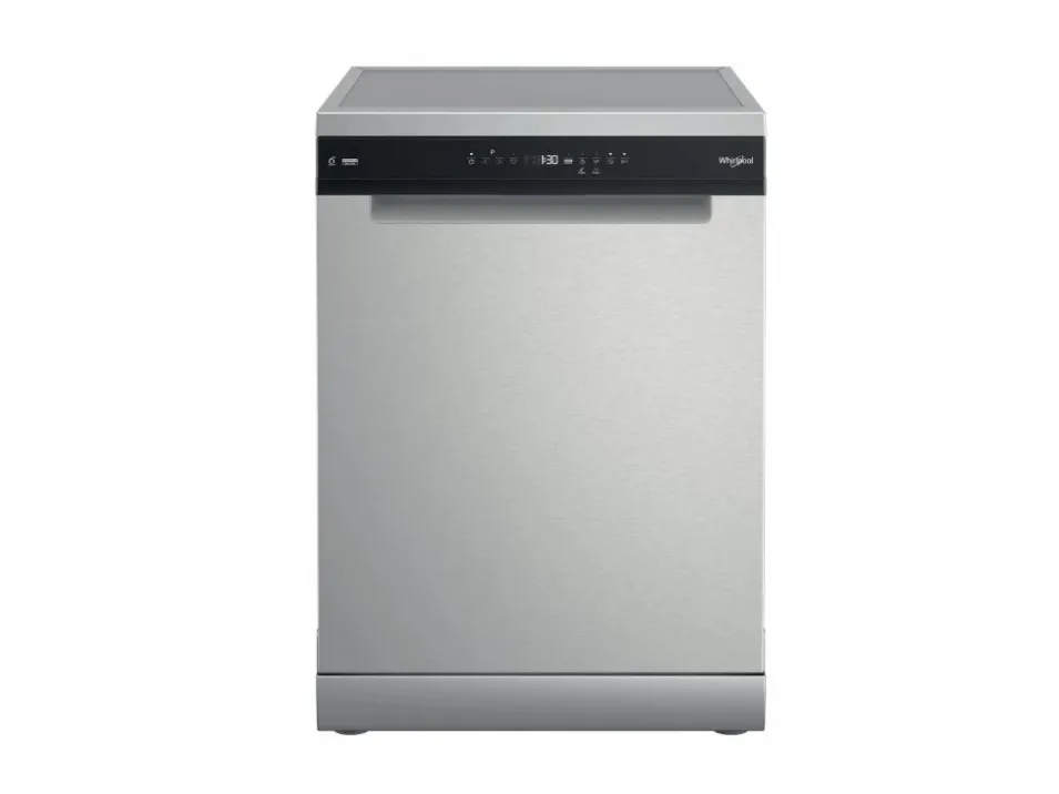 Whirlpool W7F HP33 X. Appliance placement: Freestanding, Product size: Full size (60 cm), Door colour: Stainless steel. Number of place settings: 15 place settings, Noise emission class: B, Noise level: 43 dB. Energy efficiency class: D, Water consumption per cycle: 9.5 L, Energy consumption per 100 cycles: 86 kWh. Width: 600 mm, Depth: 595 mm, Height: 850 mm. Whirlpool technologies (dish washing): 6th Sense