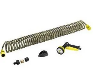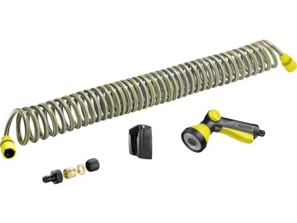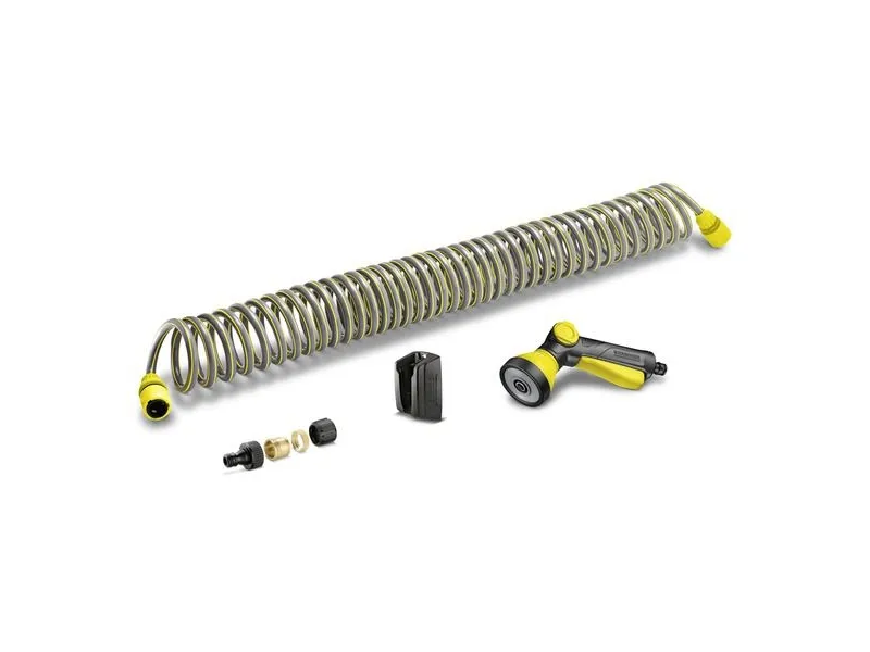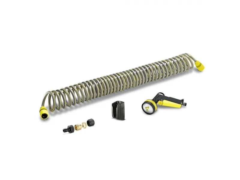 bruserSpiralslangesættet tilbyder ideelle forudsætninger for regelmæssige vandingsopgaver i småhaver, terrasser, altaner eller til camping. Ikke længere tidskrævende og anstrengende brug af vandkander eller træk i slanger. Spiralslangesættet fra Kärcher er en ægte hjælp og altid klar til alle vandingsaktiviteter. Udstyrdetaljer: 10 m UV-bestandig spiralslange, multifunktions-sprøjtepistol, 1 x spiralslangekobling med knækbeskyttelse, 1 x spiralslangekobling med knækbeskyttelse og Aqua Stop, hanetilslutning G3/4, hanetilslutning til indvendige armaturer samt en vægholder. Selv groft snavs kan takket være den medfølgende multifunktions-sprøjtepistol nemt fjernes fra haveredskaber og så videre. Spiralslangen vinder sin kompakte form tilbage efter ethvert behov og kan opbevares pladsbesparende i vægholderen. Med den medfølgende hanetilslutning til indvendige armaturer kan spiralslangen endda tilsluttes til en