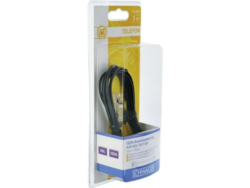 This SCHWAIGER® connection cable is used to connect a modem to a DSL splitter for a home network.Schwaiger 3.0m RJ-11 - RJ-45. Cable length: 3 m, Connector 1: RJ-11, Connector 2: RJ-45