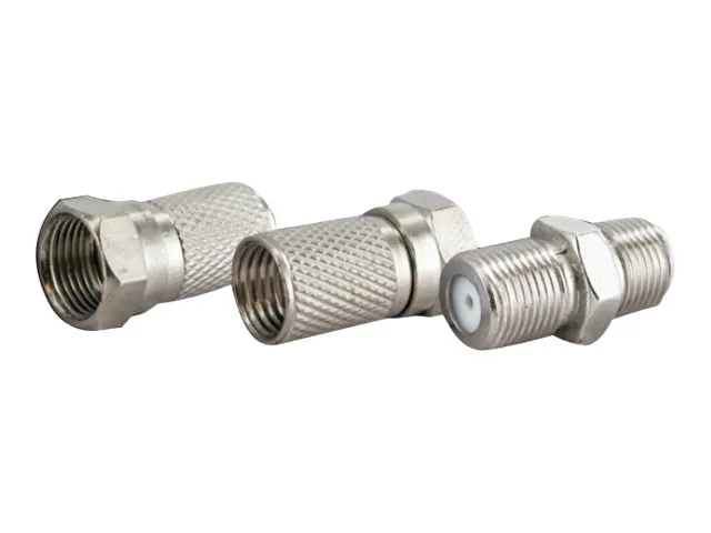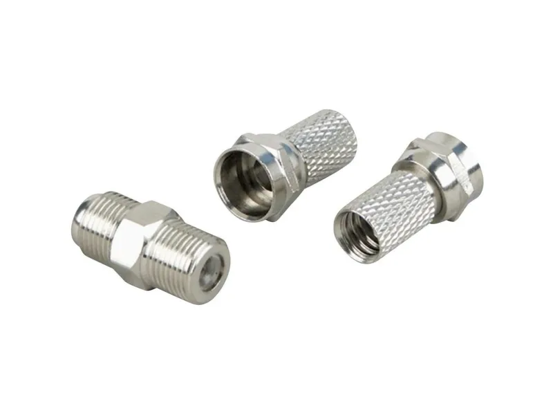 This SCHWAIGER set consists of two F connectors, which are suitable for installation on coaxial cables, and an F connecting piece, which is used to extend SAT connection cables equipped with F connectors. After the cable has been thoroughly stripped, the F connectors are simply screwed onto the sheath. A suitable stripping tool and aids for screwing on the connectors are available from SCHWAIGER.