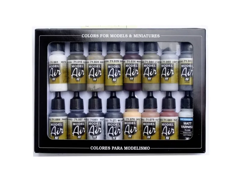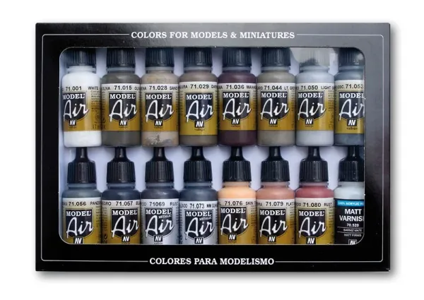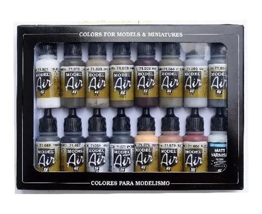 Set of 16 Model Air references for painting models, figures and dioramas. Containing bottles of 17 ml./0.57 fl.oz. (with eyedropper) and a color chart.