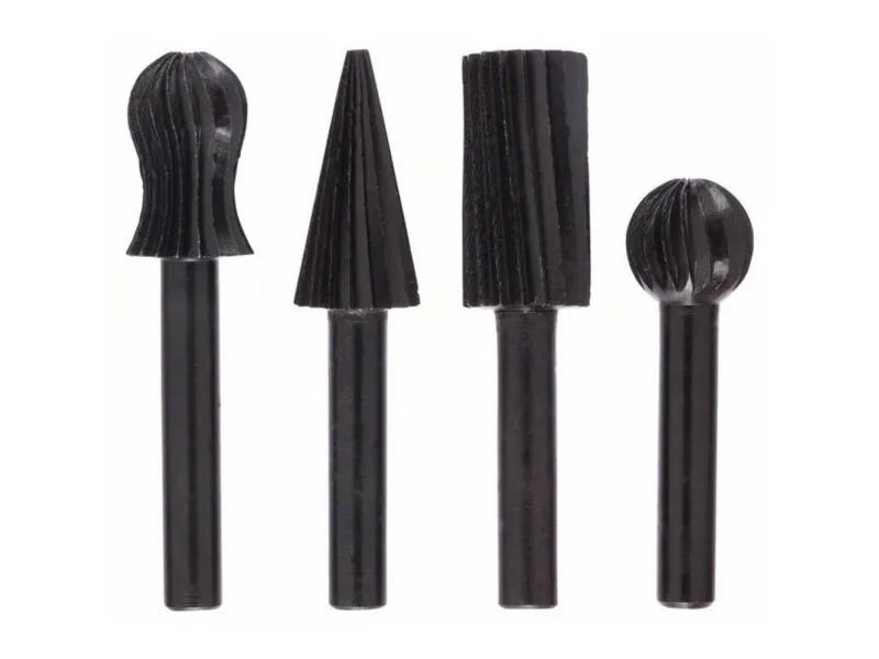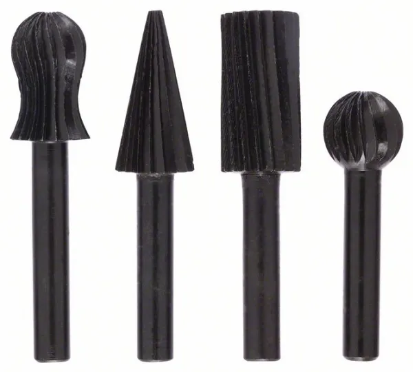The Freehand Router Bit Set, 4-Pieces contains accessories that enable deburring and working on various forms in a wide range of materials. The contained router bits feature concave, conical, cylindrical and round shapes, making the set ideal for various applications in wood and non-ferrous metals as well as in iron. The bits have a cylindrical shank system and are intended for use with drill drivers at speeds of 1,000 to 2,000 rpm.