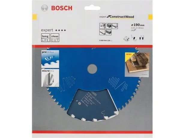 The Expert for Construct Wood circular saw blade is strongly resistant when cutting construction wood. Its unique extra-hard Microteq teeth are produced in-house by Bosch from highly durable carbide grains, enabling high-performance cutting and a long lifetime. This is further supported by the blade's combination of a special tooth design and a wide tooth spine. Furthermore, its specially designed anti-vibration slots enable particularly smooth cutting with considerably less noise and significantly reduced vibration. Additionally, the Expert for Construct Wood circular saw blade features Proteqtion coating, which prevents corrosion and delivers reliable cutting while reducing friction. Use this saw blade in construction site timber with foreign bodies such as nails and concrete residues. It is compatible with plunge and hand-held saws.