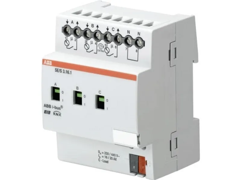 Se/S3.16.1 energiaktuator, 3-dobbelt, 16/20 A, REGTil registrering af energiforbrug og forskellige elektriske størrelser i slutstrømkredsen. Forskellige elektriske størrelser kan overvåges ved hjælp af tærskelværdier, og spidsbelastninger kan begrænses ved hjælp af en enkel efterspørgselsreaktion. De registrerede værdier stilles til rådighed via ABB i-bus KNX. De elektriske forbrugere (veksel- eller vekselstrøm), der er tilsluttet via potentialfrie, uafhængige kontakter, kan via ABB i-bus KNX eller manuelt tilsluttes via skifteknudsen. Energiaktuatoren er særligt egnet til kobling af ohmske, induktive og kapacitive belastninger. Koblingsudstyret svarer til koblingsaktuatorer C-belastning SA/S X.196.1.