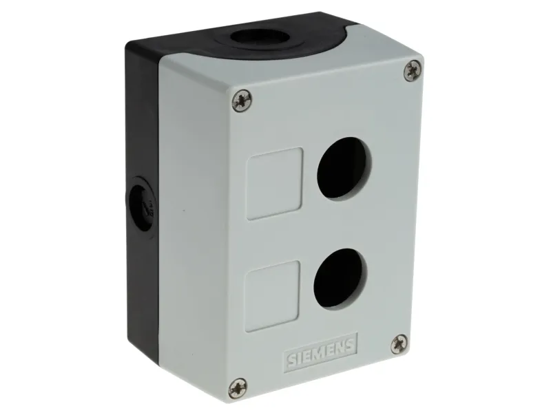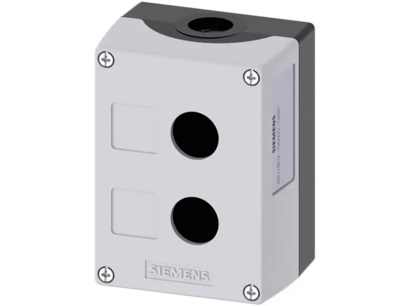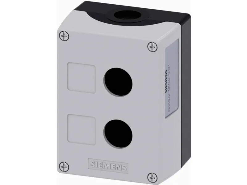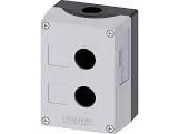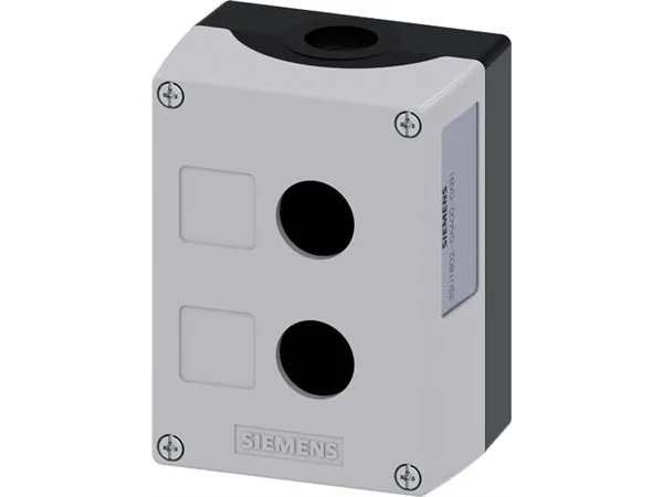 kommandofestederKabinet til befalingsapparater, 22 mm, rund, husmateriale plast, kabinetoverdel grå, 2 kommandofesteder plast, fordybning til skilte, uden bestykning kabinet SIRIUS ACT til montering af 22,5 mm kommando- og meldeapparater ved rumligt adskilt placering af styreenheder og kontaktskabe.Under mærkenavnet SIRIUS ACT tilbyder Siemens en unik portefølje af kommando- og meldeapparater med globale produktgodkendelser i fire moderne designrækker af robust ægte metal og plast i høj kvalitet.Det innovative knapkoncept forenkler monteringen så meget, at det kun kræver en hånd og ikke noget specialværktøj. Som monteringsboringer rækker ufrie huller, da der allerede er integreret en 100% vridningsbeskyttelse.Takket være den konstant høje beskyttelsesklasse er de robuste enheder industriegnede og egnet til udendørs anvendelse. Det er endda muligt at rengøre med højtryksstråle. Hverken støv, olier eller aggressive lud kan forstyrre