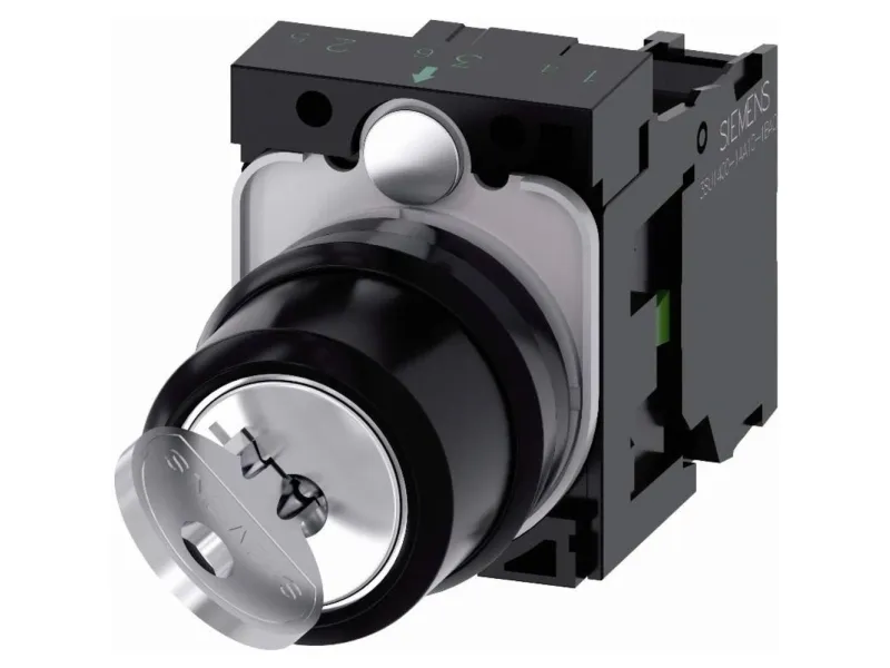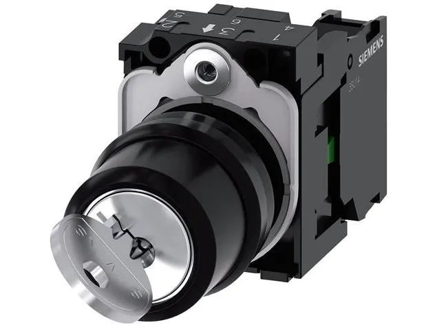 Nøgleomskifter 3SURONIS key-operated switch, 22 mm, round, plastic, lock number SB30, with 2 keys, 2 switch positions O-I, latching, 10:30h/13:30h, key removal O+I, with holder, 1 NO, screw terminal, possible special locks: SB31, 421, 455 Key-operated switches SIRIUS ACT for meeting higher demands for access security. Under the brand name SIRIUS ACT, Siemens offers a unique portfolio of pushbuttons and signaling devices with global product approvals in four modern design lines of rugged genuine metal and high-grade plastic. An innovative snap-on concept makes the task of installing a unit so easy that it can be done with one hand and without any special tools. Groove-free holes are adequate as mounting holes since full twist prevention is already integrated. Thanks to the high degree of protection throughout, the rugged devices are suitable for use in industry and outdoors. Even cleaning with a high-pressure jet is possible. Nei