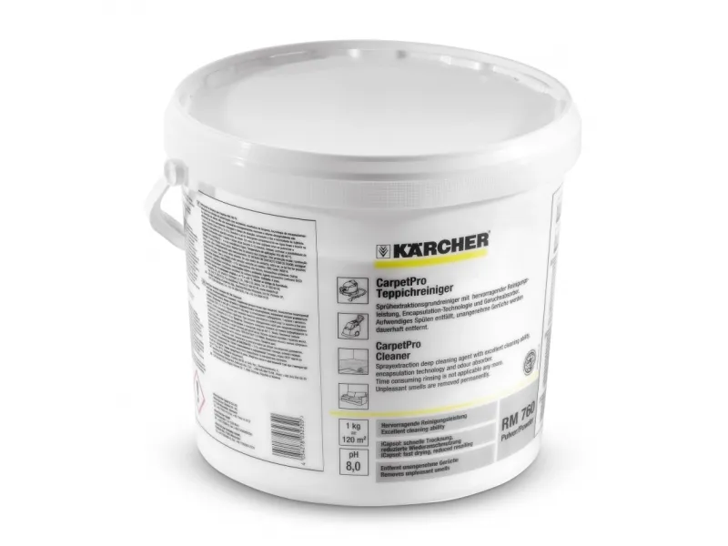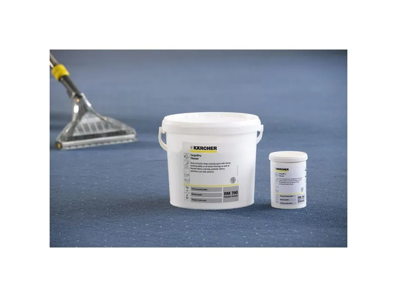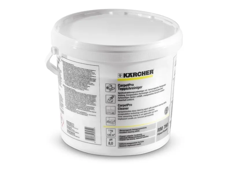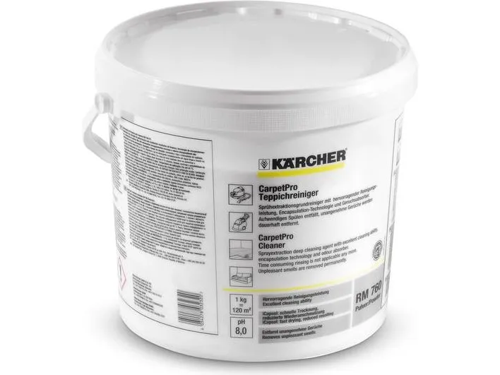 The CarpetPro Cleaner RM 760 Powder is a spray extraction deep cleaner with encapsulation technology and odour eliminator. Permanently eliminates unpleasant odours. No need for time-consuming rinsing.\n\n- Effective cleaning agent for spray extraction of textile coverings and upholstery\n- Dissolves heavy oil, grease and mineral stains\n- iCapsol Technology: No rinsing necessary therefore quick accessible\n- Powder-shaped\n- Gentle on materials\n- Cleaning active in all temperature ranges\n- With integrated Deodorizer. Effectively removes unpleasant odors such as sweat, urine, nicotine, etc.\n- Shorter drying time\n- Improves soil health\n- Free from bleaches\n- Pleasant, fresh fragrance\n\nFloor cleaning at:\n- Car dealership and garage\n- Building Industry\n- Contract cleaning\n- Retirement homes, doctor‘s surgery\n- Floor cleaning\n- Hotels, gastronomy, catering\n- Industry\n- Municipal\n- Retail