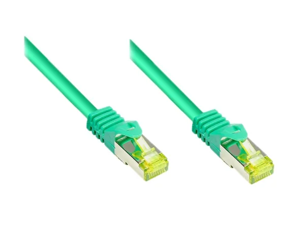 RJ45 liitäntäkaapeli Cat.7 raakakaapelilla ja lukitussuojalla (RNS®), S/FTP, PiMF, halogeeniton, 600MHz, OFC, vihreä, 15m, Good Connections® (8070R-150G)