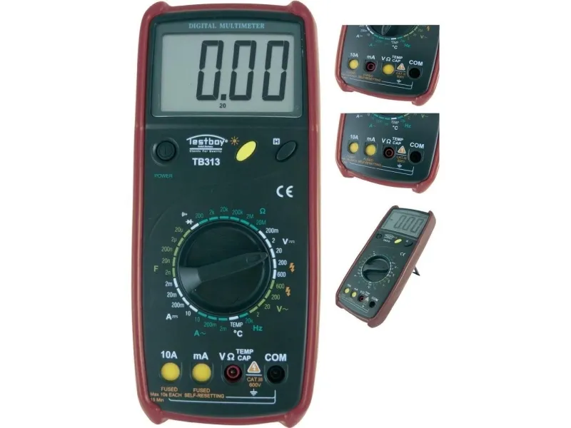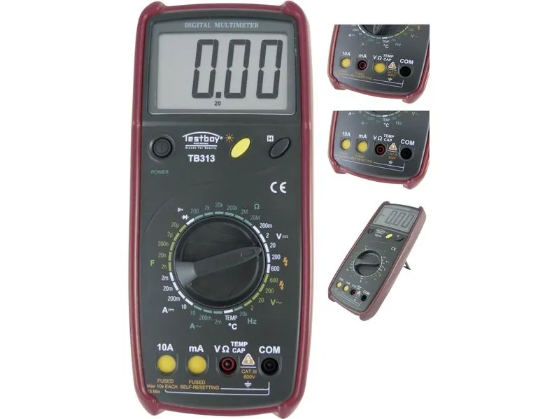 Digitaalinen yleismittari jänniteanturilla TB 313 DC ja AC 600 V:iin asti - DC ja AC 10 A:iin asti - Automaattinen liittimen valinta - Jatkuvuustestaus - Dioditesti - Data Hold -toiminto - Taustavalo - IEC/EN 61010-1 (DIN VDE 0411) - 5 vuoden tehdastakuu - Ohjelmavirheet poissuljettu automaattisella liittimen valinnalla. Testboy 313:ssa on helppolukuinen 28 mm:n LC-näyttö, taustavalo ja mekaaninen mittausalueen suojaus. Mittausalueen suojaus tekee virheellisen käytön mahdottomaksi. DC ja AC 600 V:iin asti Mekaaninen mittausalueen suojaus Diodi- ja jatkuvuustestaus Diodi- ja jatkuvuustestaus Mittausalueen lämpötila: -20 - +1000 °C CAT III 600 V