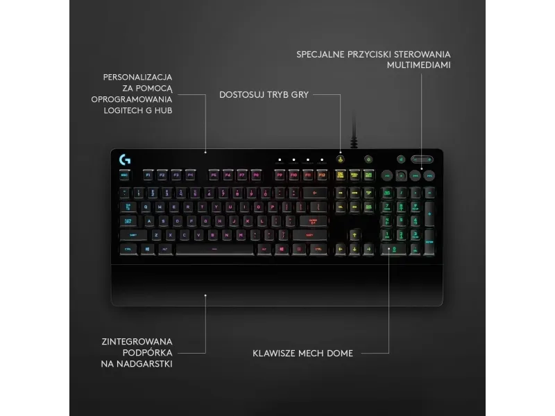 The G213 Prodigy gaming keyboard features Logitech Mech-Dome keys that are specially tuned to deliver a superior tactile response and performance profile similar to a mechanical keyboard. Mech-Dome keys are full height, deliver a full 4mm travel distance, 50 g actuation force, and a quiet sound operation. The G213 Prodigy gaming keyboard was designed for gaming, featuring ultra-quick, responsive feedback that is up to 4x faster than the 8 ms report rate of standard keyboards and an anti-ghosting matrix that keeps you in control when you press multiple gaming keys simultaneously.