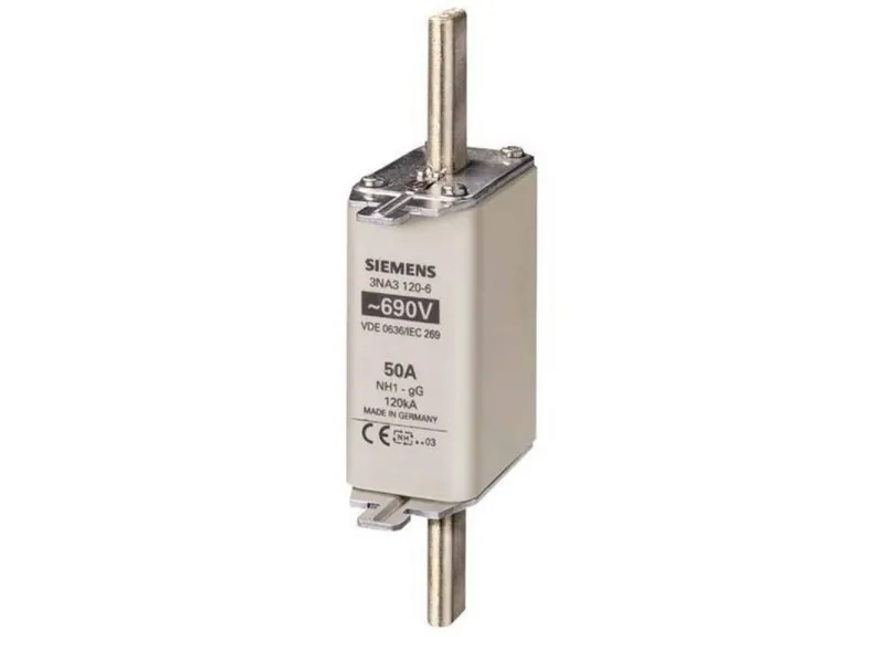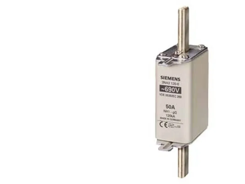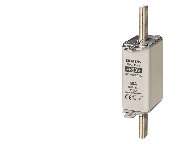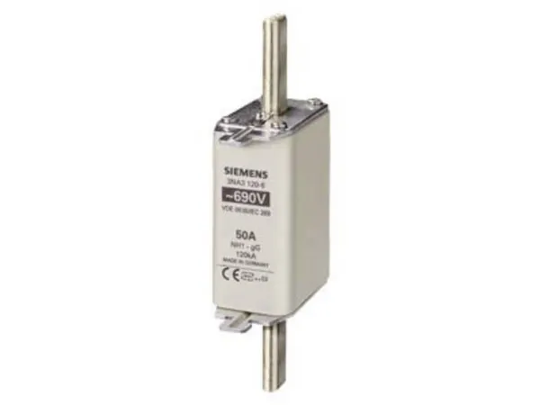NH-sikringsindsats, NH1, i: 50 A, GG, UN AC: 690 V, UN DC: 440 V, ... NH-sikringsindsats, NH1, i: 50 A, GG, UN AC: 690 V, UN DC: 440 V, frontmelder, spændingsførende NH-sikringssystem 3NA, 3ND til selektiv lednings- og anlægsbeskyttelse. NH-sikringssystemet fra Siemens som vigtig del af SENTRON beskyttelseskomponenter til el-installationer giver effektiv person-, apparat- og anlægsbeskyttelse med sikker frakobling i tilfælde af overbelastning og kortslutning. I sammenligning med ledningsbeskyttelseskontakter kan højere kortslutningsstrømme opnås samtidig med bedre strømbegrænsning. NH-sikringssystemet er især kendetegnet ved: 1. Kombialarmen signalerer, at sikringen slukkes ved hjælp af et tydeligt farveskift, der går fra rød til hvid. 2. Mere sikkerhed ved udskiftning med isolerede gribeflige. 3. Høj selektivitet og lave omkostninger. 4. Langvarig og sikker drift takket være forsølvede kontaktknive. 5. Der kan fås sikringsindsatser fra 2 A til 1250 A og i størrelserne 000, 00, 0, 1, 2, 3,