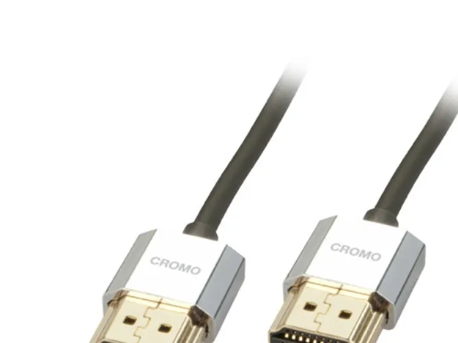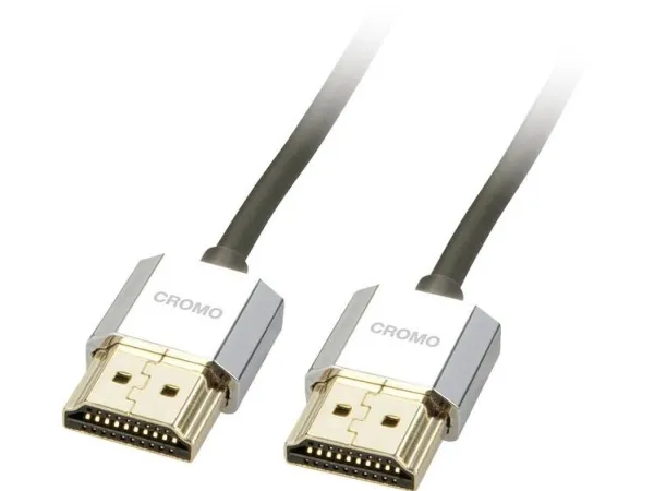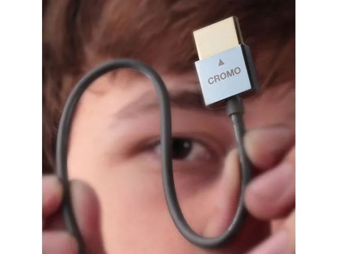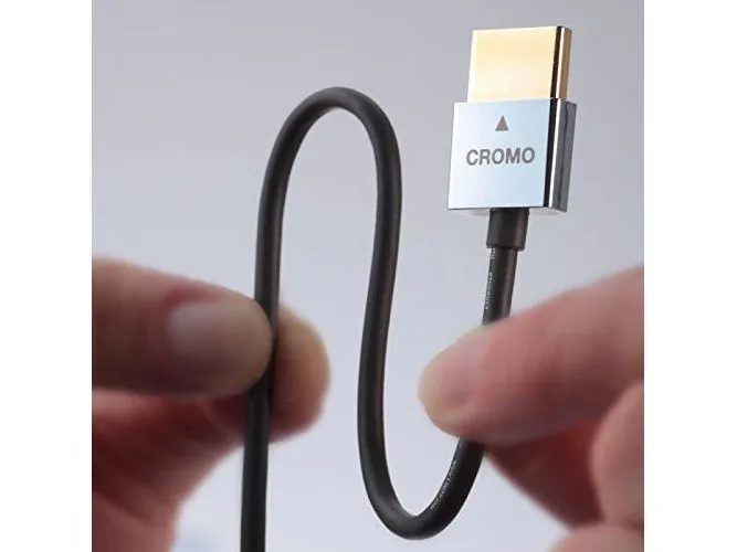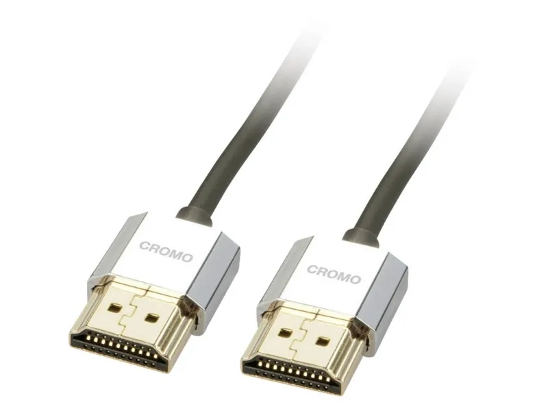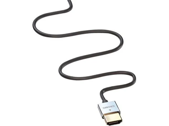 Ultra flexible, light cable with low profile, slimline HDMI connectors_x000D_ 24K gold plated contacts with chrome plated connector hoods, fully shielded cable and strain relief_x000D_ HDMI 2.0 compliant, supporting Ultra HD up to 4K 2160p60 and 4K 3D_x000D_ Supports 3D 1080p and HDCP_x000D_ 10 year warranty_x000D_ _x000D_ The CROMO® Slim High Speed HDMI Cable with Ethernet is an affordable, high quality cable featuring gold plated contacts for better conductivity and resistance to corrosion and tarnishing._x000D_ _x000D_ This super thin and flexible HDMI cable has been specially designed for connection to devices in confined spaces or with restricted access to the HDMI ports. The slim form factor also reduces the weight of the cable by around 80% compared to the standard CROMO® cables making it perfect for connecting to awkwardly placed devices in a rack or to displays mounted close to a wall._x000D_ _x000D_ HDMI ATC (Authorised Test Centre) certified for High Speed Category 2 compliance. Ethernet support allows compatible devices to connect to the internet_x000D_
