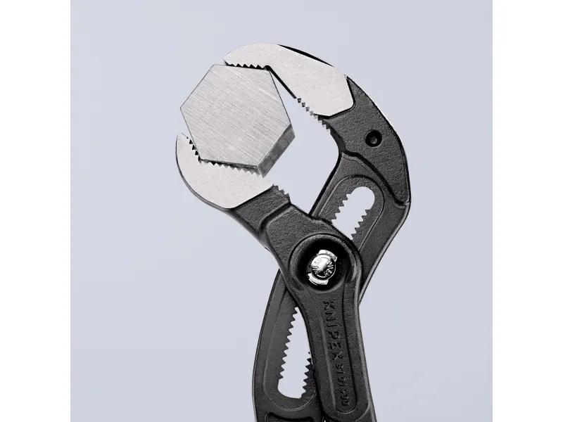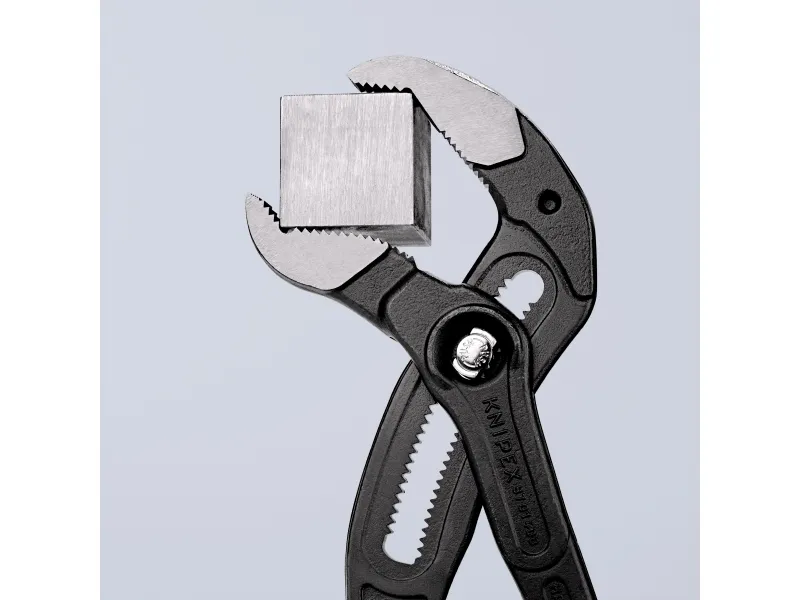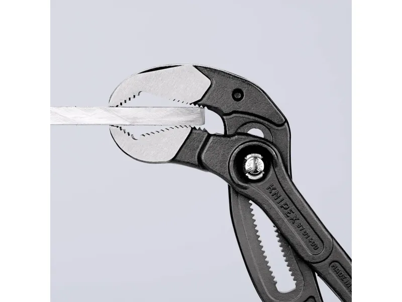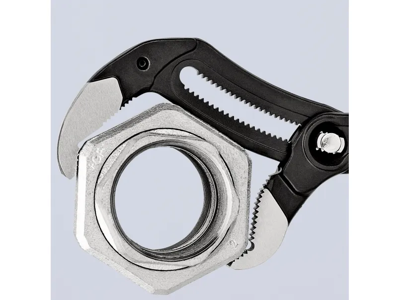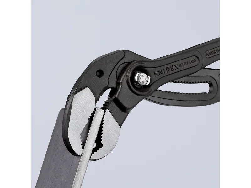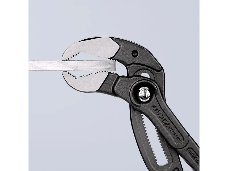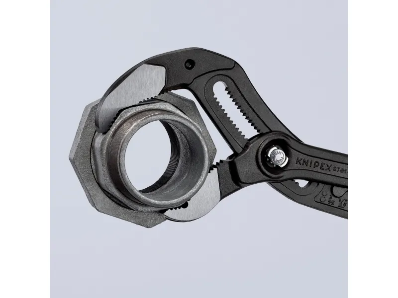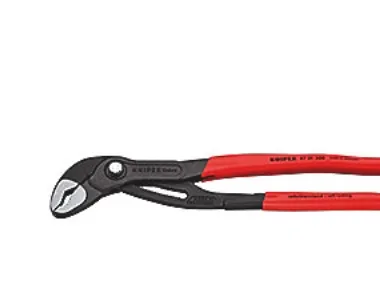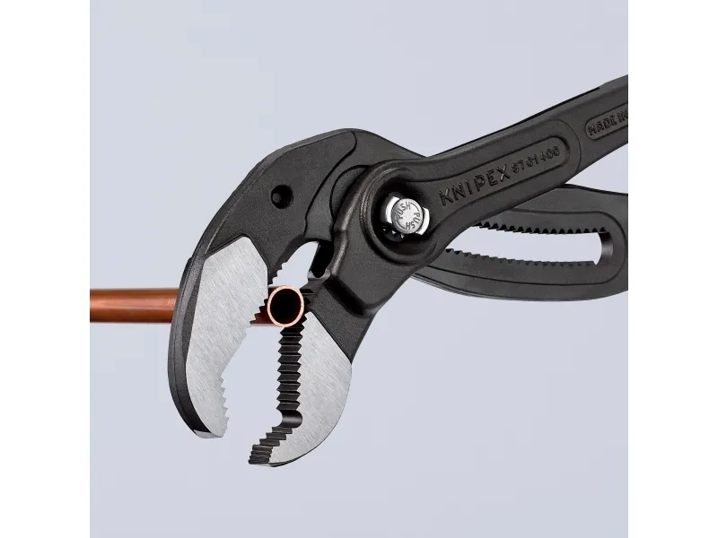 Both the KNIPEX Cobra® XL and XXL offer the performance and comfort of water pump pliers while being lighter in weight and having a greater gripping capacity than comparable pipe wrenches. The Cobra® XL can e.g. grip a 2“ pipe fitting and weighs 50 % less than a 2“ pipe wrench, which has a much lower gripping capacity. With its handy length of 400 mm, the Cobra® XL also fits into a plumber's tool kit. The Cobra® XXL comes along with the weight of a 2“ pipe wrench but offers a back-up gripping capacity up to 4 1/2“.Knipex Cobra XL. Type: Slip-joint pliers, Maximum pipe/tube diameter: 9 cm, Maximum nut size: 9.5 cm. Length: 400 mm, Weight: 1.21 kg