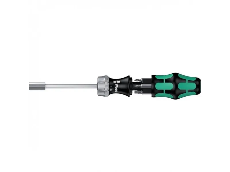 Wera compact tool with multi-component Kraftform handle for high working speeds and particularly ergonomic screwdriving. Integrated bit magazine in the handle. Includes ratchet: fine-pitched for small return angle, switchover ring (right, fixed, left), maximum torque of up to 50 Nm; hexagonal blade with 1/4" hexagon socket take-up, stainless sleeve, strong permanent magnet.