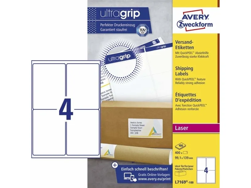 Product Description: - 139 x 99.1 mm. - Laser / Colour Laser / Inkjet. - 400 Total Labels. - For: Shipping / Mailing. - eco-friendly. - Colour: White. - Works best with: parcels and shipping. - 100 Sheets per Pack. - 4 Labels per Sheet. - Permanent Adhesive. - Rectangular. - on A4 sheet. - Detail: with QuickPEEL™ feature; completely hide old text.