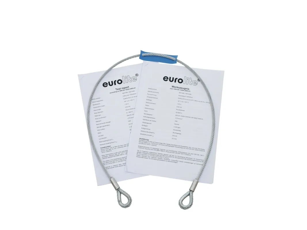 The EUROLITE safety bonds comply with the current regulation of the German professional insurance association as summed up in BGI 810-3:2007-03 Loads above persons. The safety bonds are constructed in accordance with the European standards DIN EN 12385-4:2008-06 and DIN 56927:2009-03.
