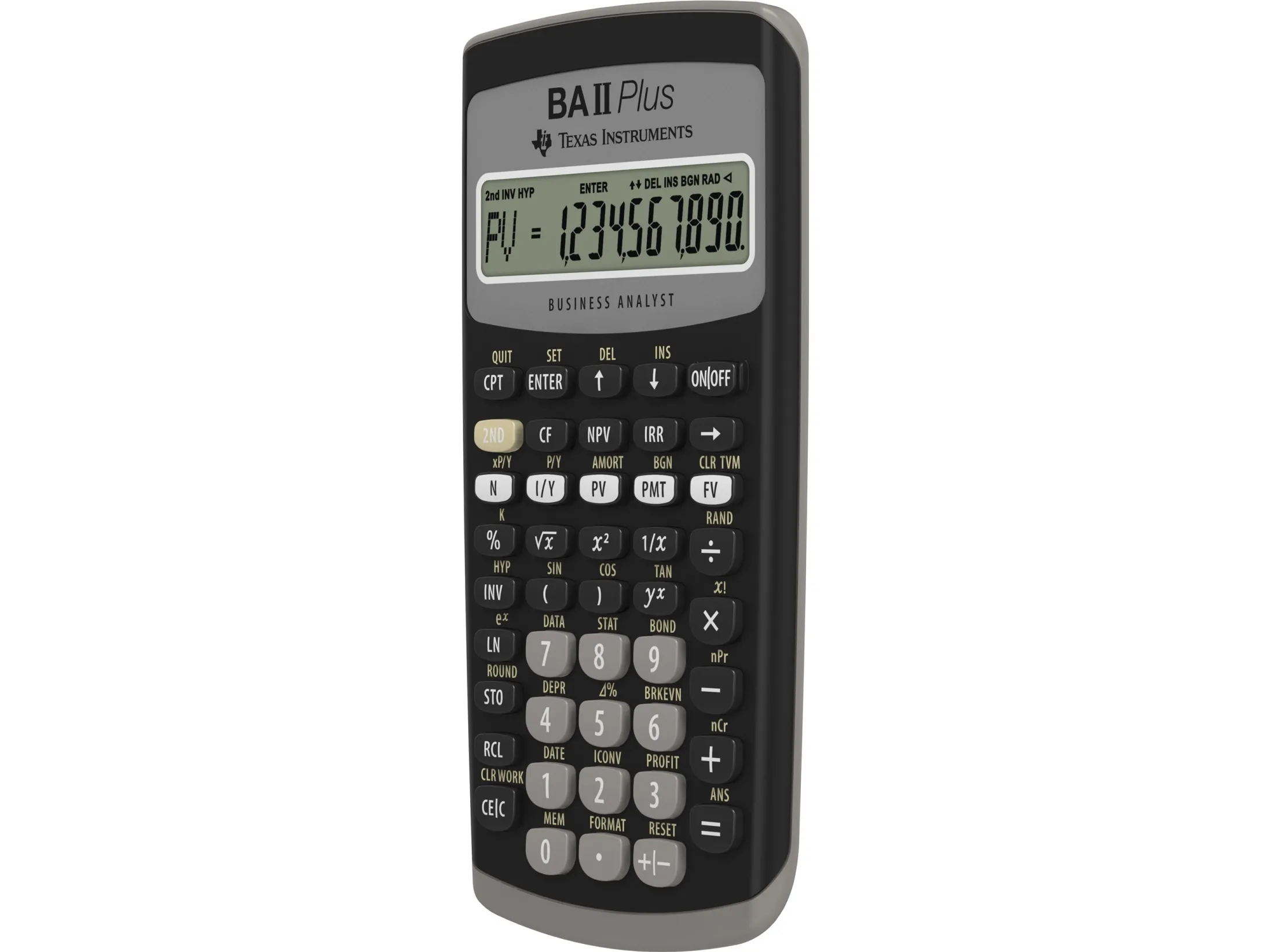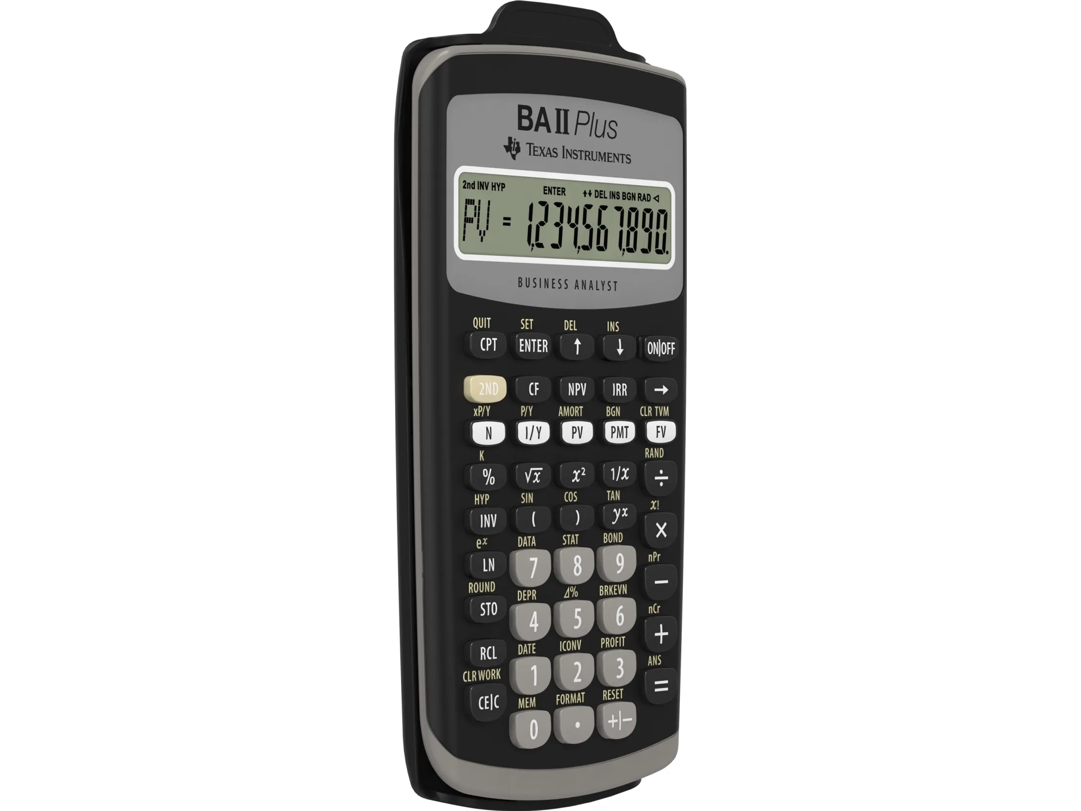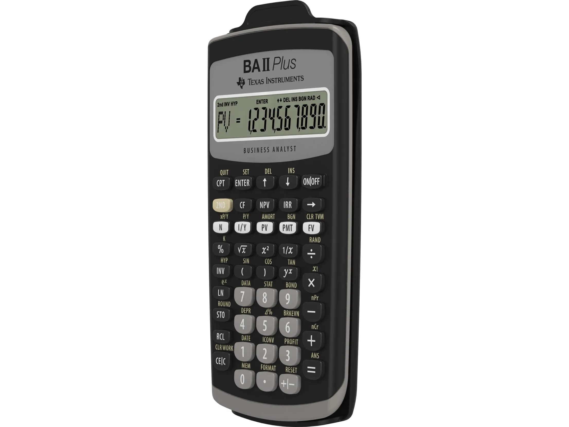 BA II Plus. Ihanteellinen laskin tilastotieteilijöille, johtajille ja talousasiantuntijoille. * Laske TVM (Time-Value-Money), annuiteetit, futuurit, leasings/vuokrasopimukset, säästöt ja paljon muuta. * Luo kuoletuskaaviot. * Suorittaa kassavirta-analyysin jopa 24 eri kassavirralle jopa 4-numeroisella taajuudella, laskee nettonykyarvon ja sisäisen korkokannan. * Tilastot 1 tai 2 muuttujaa ja 4 regressiovaihtoehtoa: lineaarinen, logaritminen, eksponentiaalinen ja teho. * 4 eri menetelmää poistojen, kirjanpitoarvon ja jäännösarvon laskemiseksi. * Laskee myös: tasapainopisteen, korkomuunnokset, delta%, voiton ja tappion. * Matemaattisiin funktioihin kuuluvat trigonometriset laskutoimitukset, luonnolliset logaritmit ja potenssit. * Iskunkestävä suojakotelo. * Paristokäyttöinen. * APD (Automatic Power Down) pidentää akun käyttöikää.Katso UN 38.3 Testin yhteenveto linkistä "Muut asiakirjat".