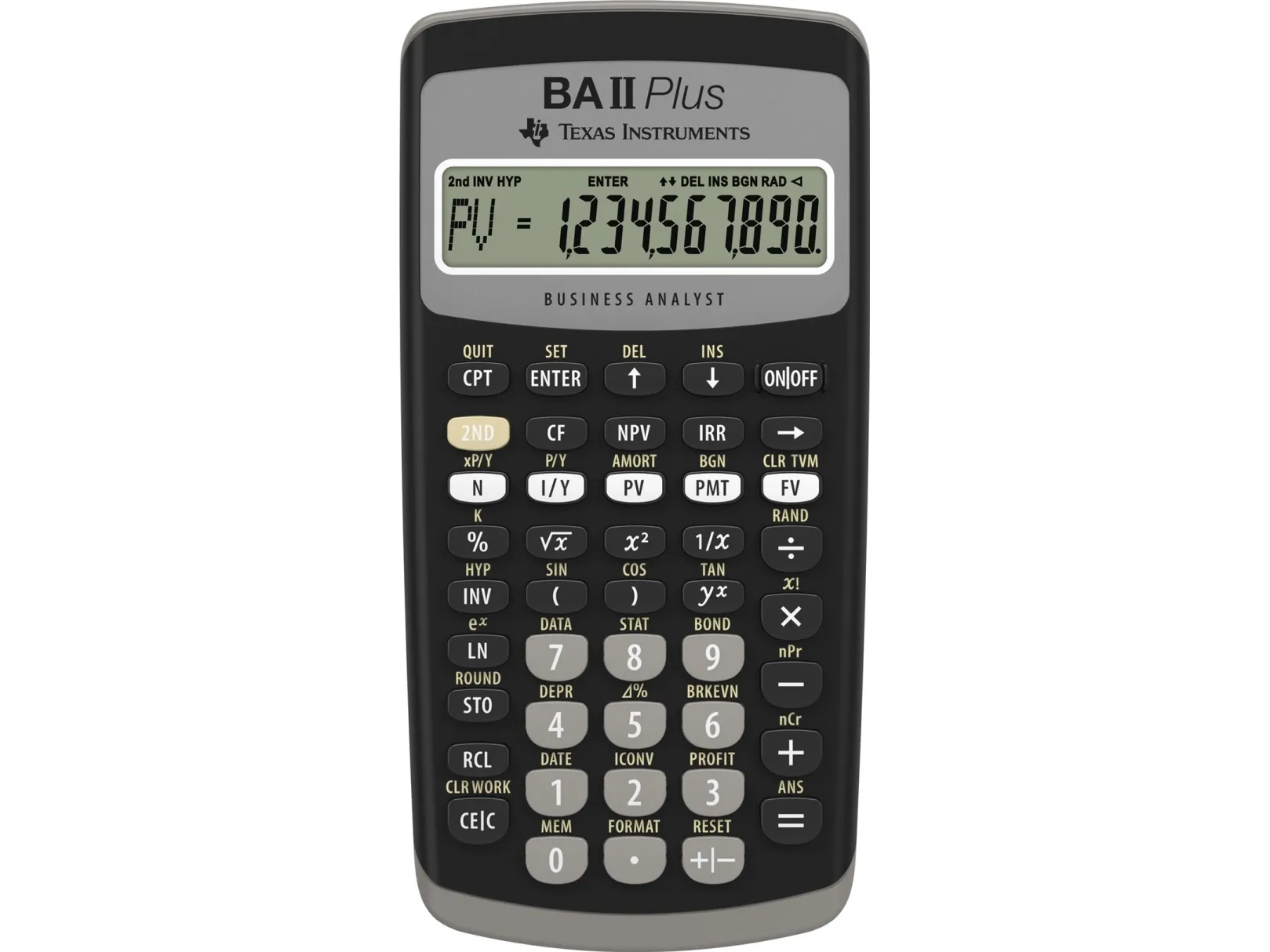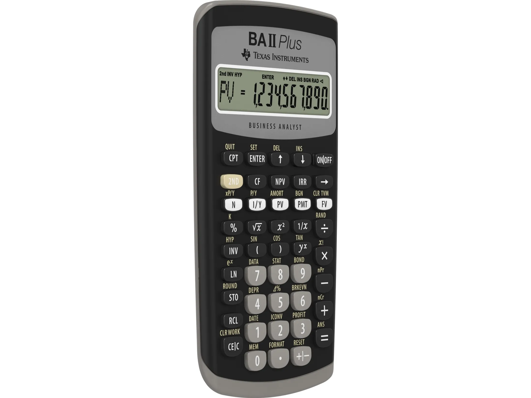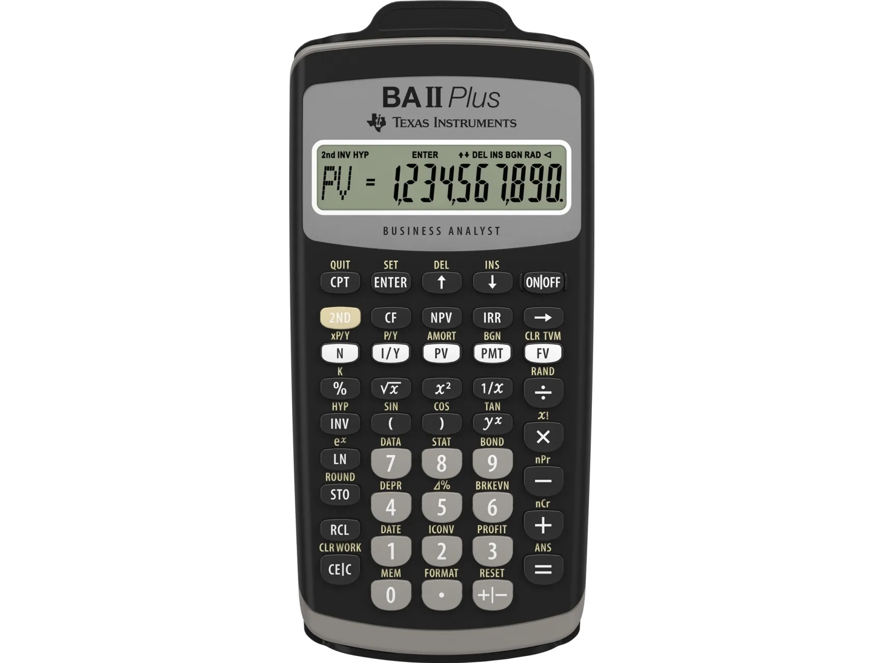 BA II Plus. Ihanteellinen laskin tilastotieteilijöille, johtajille ja talousasiantuntijoille. * Laske TVM (Time-Value-Money), annuiteetit, futuurit, leasings/vuokrasopimukset, säästöt ja paljon muuta. * Luo kuoletuskaaviot. * Suorittaa kassavirta-analyysin jopa 24 eri kassavirralle jopa 4-numeroisella taajuudella, laskee nettonykyarvon ja sisäisen korkokannan. * Tilastot 1 tai 2 muuttujaa ja 4 regressiovaihtoehtoa: lineaarinen, logaritminen, eksponentiaalinen ja teho. * 4 eri menetelmää poistojen, kirjanpitoarvon ja jäännösarvon laskemiseksi. * Laskee myös: tasapainopisteen, korkomuunnokset, delta%, voiton ja tappion. * Matemaattisiin funktioihin kuuluvat trigonometriset laskutoimitukset, luonnolliset logaritmit ja potenssit. * Iskunkestävä suojakotelo. * Paristokäyttöinen. * APD (Automatic Power Down) pidentää akun käyttöikää.Katso UN 38.3 Testin yhteenveto linkistä "Muut asiakirjat".