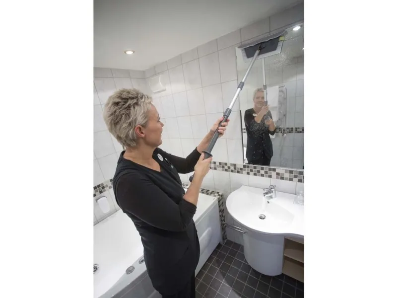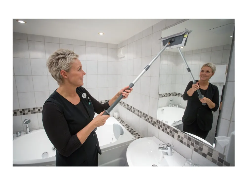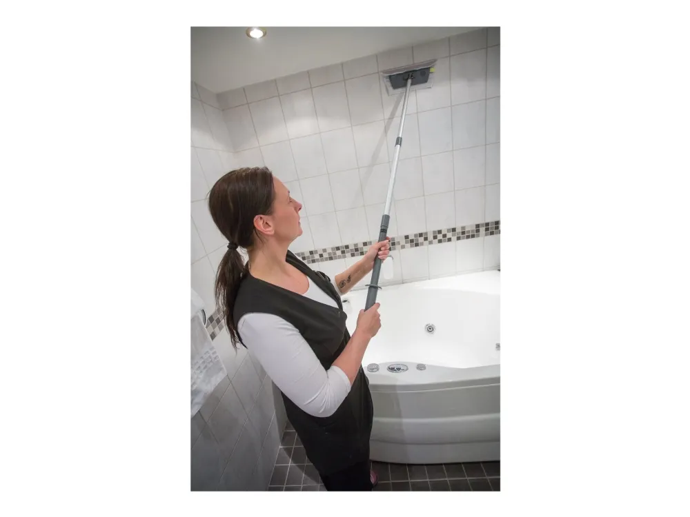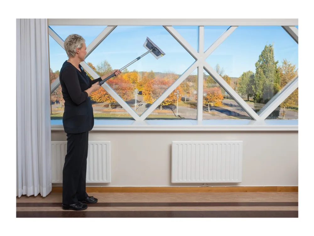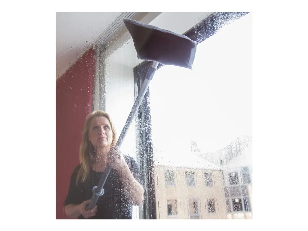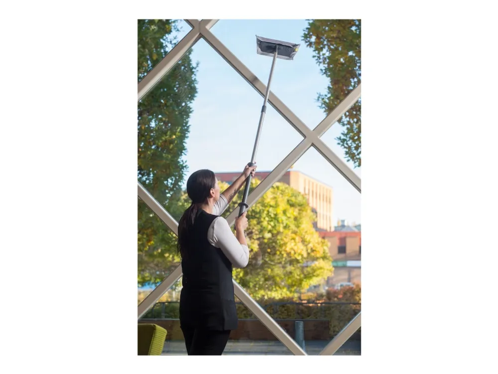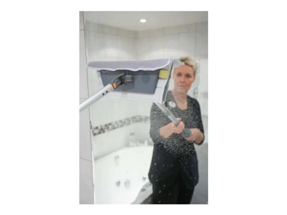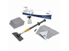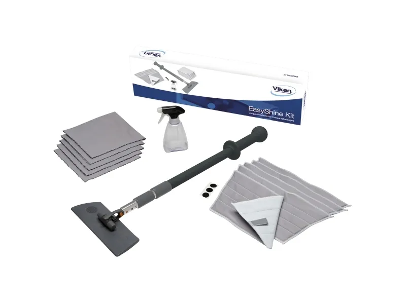 Vikan Easy Shine Kit med fleksibel moppefremfører er en komplet løsning til rengøring af vinduer, spejle, fliser, rustfrit stål, whiteboards og andre højglanspolerede overflader, herunder buede flader som svingdøre, badekar, jacuzzier, buede plastiksæder og bilruder. Sættet indeholder 5 vinduesmopper, 5 klude, 1 sprayflaske, 1 Ultra Flex moppefremfører og 1 teleskopskaft.
