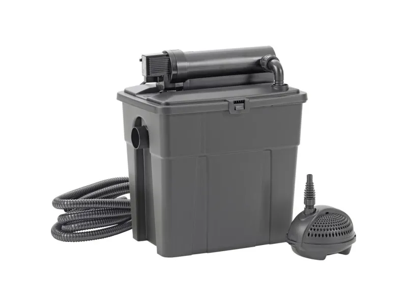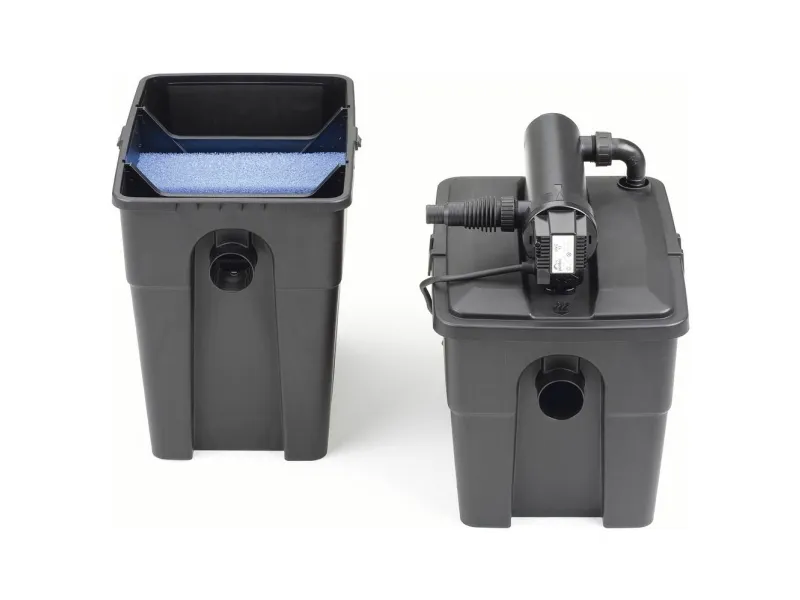 Lammikkosuodatinsarja 8000 UVC:llä ja pumpulla Kompakti suodatinsarja, jossa on pumppu ja UVC-puhdistussäiliö puutarhalammikoille, joissa on tai ei ole kaloja. Monikammiosuodattimessa on neljä suodatinainetta (japanilainen matto, karkea ja hieno suodatinvaahto, orgaaniset pintaelementit) ja kaksi virtausta säätelevää väliseinää. Suodatinkannessa sijaitseva UVC-puhdistussäiliö poistaa tehokkaasti kelluvat levät. 4-vaiheinen suodatin