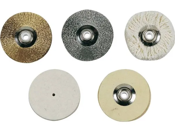 Steel wire brush for de-rusting and cleaning steel and non-ferrous metals. Brass wire brush to polish non-ferrous metals and precious metals. Felt wheel is used on painted surfaces and the chamois and cotton wheels provide a high gloss finish on non-ferrous metals and precious metals.