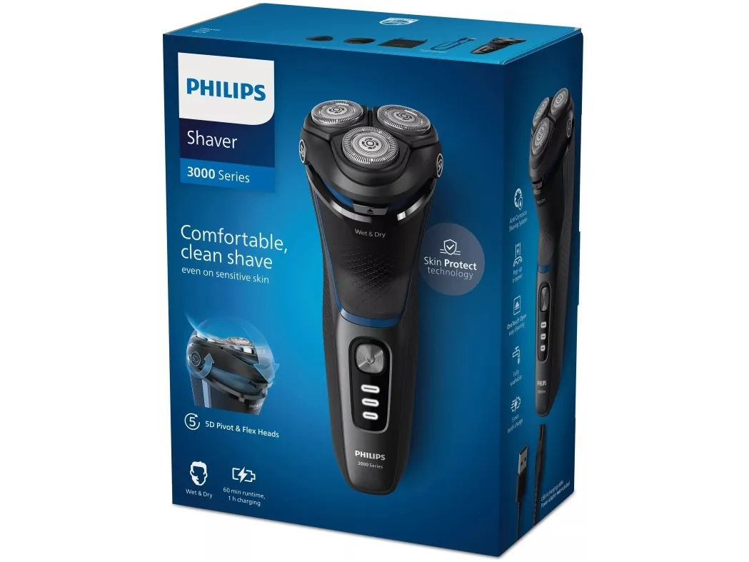 The Philips 3000 Series S3344 shaver offers a seamless and comfortable shaving experience. Designed for both wet and dry use, it caters to all preferences, ensuring maximum convenience. The shaver is equipped with 5D Pivot & Flex heads, PowerCut blades, and SkinProtect technology, which work together to provide a close yet gentle shave, protecting the skin from irritation. Its cordless operation, powered by a lithium-ion battery, delivers 60 minutes of shaving time on just a 1-hour charge, complemented by a quick charge feature for those last-minute grooming needs. The package includes a charging stand, protection cap, travel pouch, and USB cable, making it the perfect grooming companion, whether at home or on-the-go. With its fully washable design, maintenance is a breeze, ensuring hygiene and durability. The Philips 3000 Series S3344 is an essential tool for anyone looking to elevate their grooming routine.