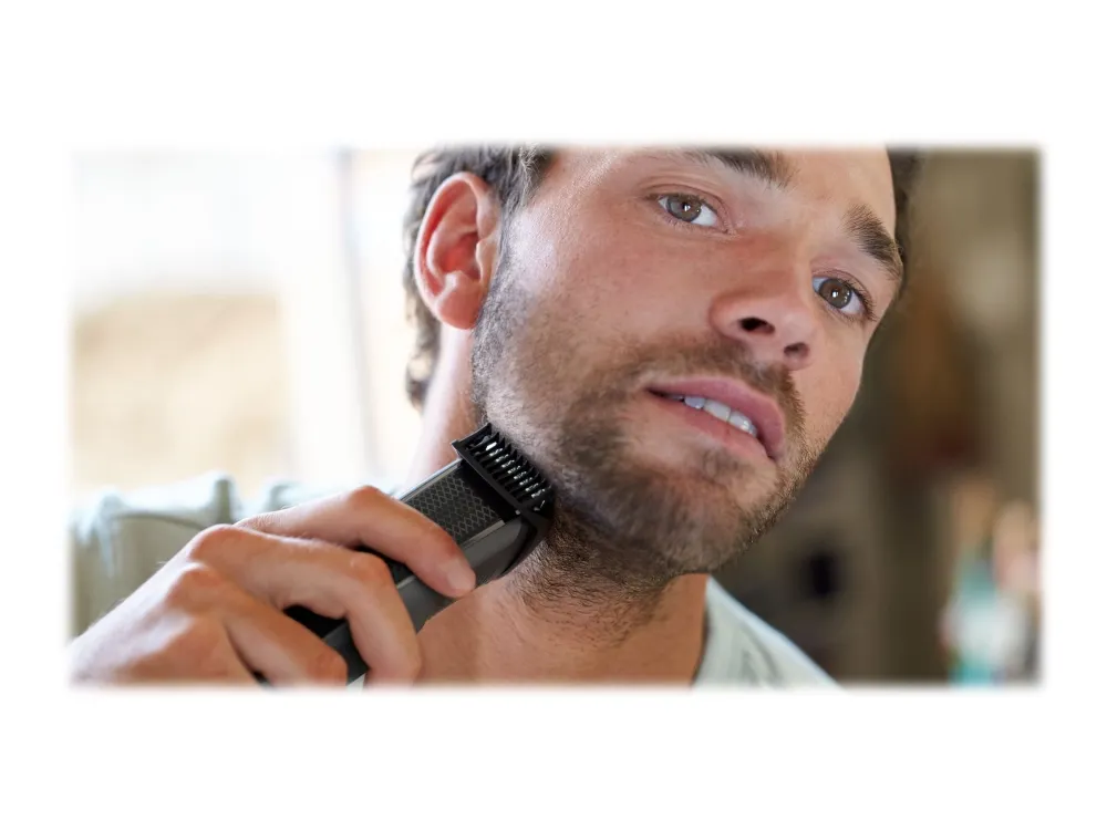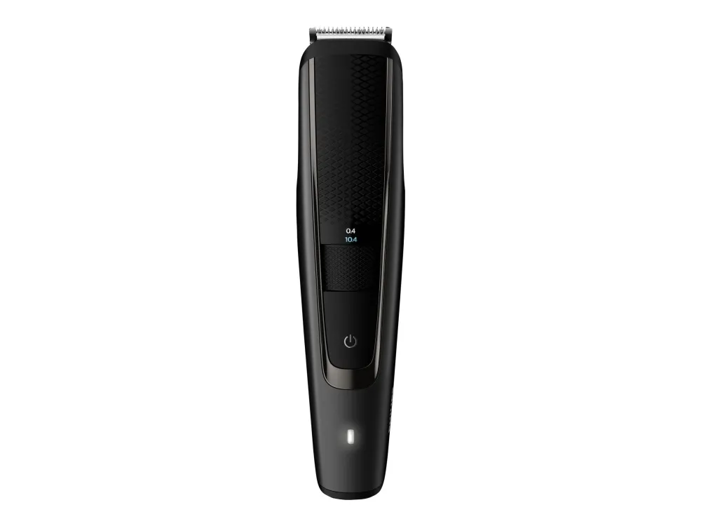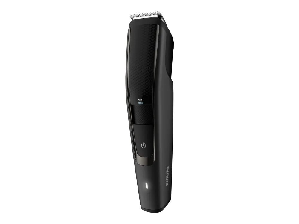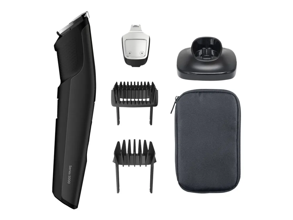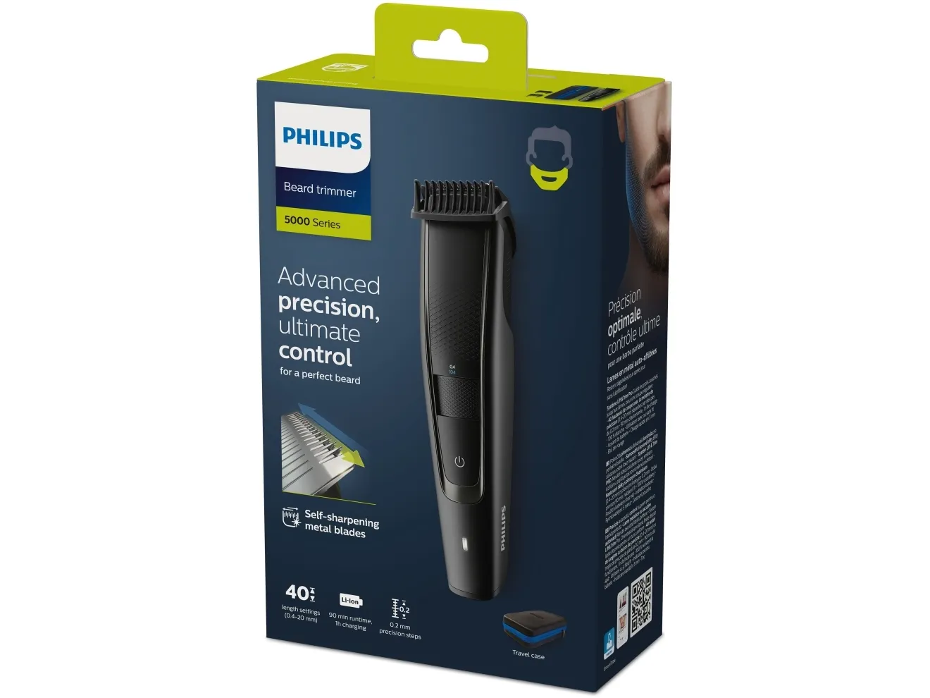 Discover the Philips BeardTrimmer Series 5000, designed for precision and ease, making every grooming session a breeze. This trimmer is a comprehensive solution for maintaining your beard at home or while traveling. With its fully washable design, you can easily clean it under the tap, ensuring a hygienic trim whether you prefer a dry or wet trim. The Philips BeardTrimmer Series 5000 stands out with its Lift & Trim PRO system and self-sharpening stainless-steel blades, providing an even trim in just one go. The trimmer offers a range of 40 length settings from 0.4 to 20 mm, allowing you to achieve the exact look you desire. Its lithium-ion battery is built for efficiency, charging fully in just one hour and delivering 90 minutes of cordless operation. Whether you're at home or traveling, the included travel case and multi-voltage power adapter ensure your grooming routine never skips a beat. Embrace the convenience, precision, and versatility of the Philips BeardTrimmer Series 5000 for a grooming experience that's efficient and reliable.