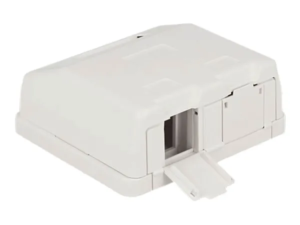 This empty box by Delock can be used as a junction box on the wall or in enclosures. With its standardized dimensions, it is suitable for easy snap-in mounting of two Keystone modules.