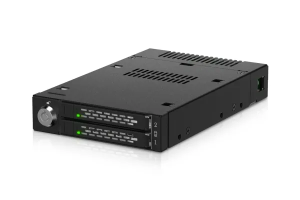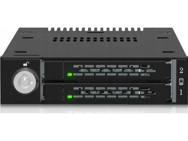 The ICY Dock ToughArmor MB834MK-B V2 is a storage drive cage designed for 3.5" drives, ensuring performance in various environmental conditions. With a robust metal construction, this device supports an operating temperature range from 0°C to 60°C and withstands humidity levels of 5 to 65% RH. Featuring two Slim SAS (SFF-8654) connectors and compatibility with M.2 form factor drives, this external storage solution allows for efficient data management and connectivity in a streamlined design.