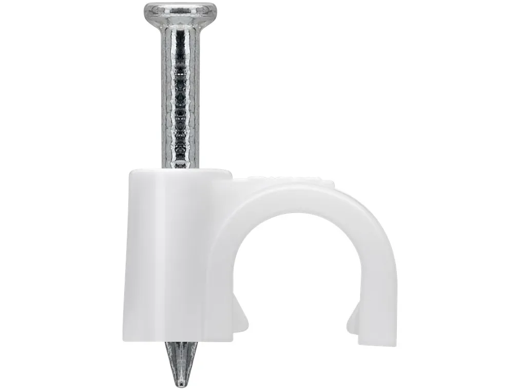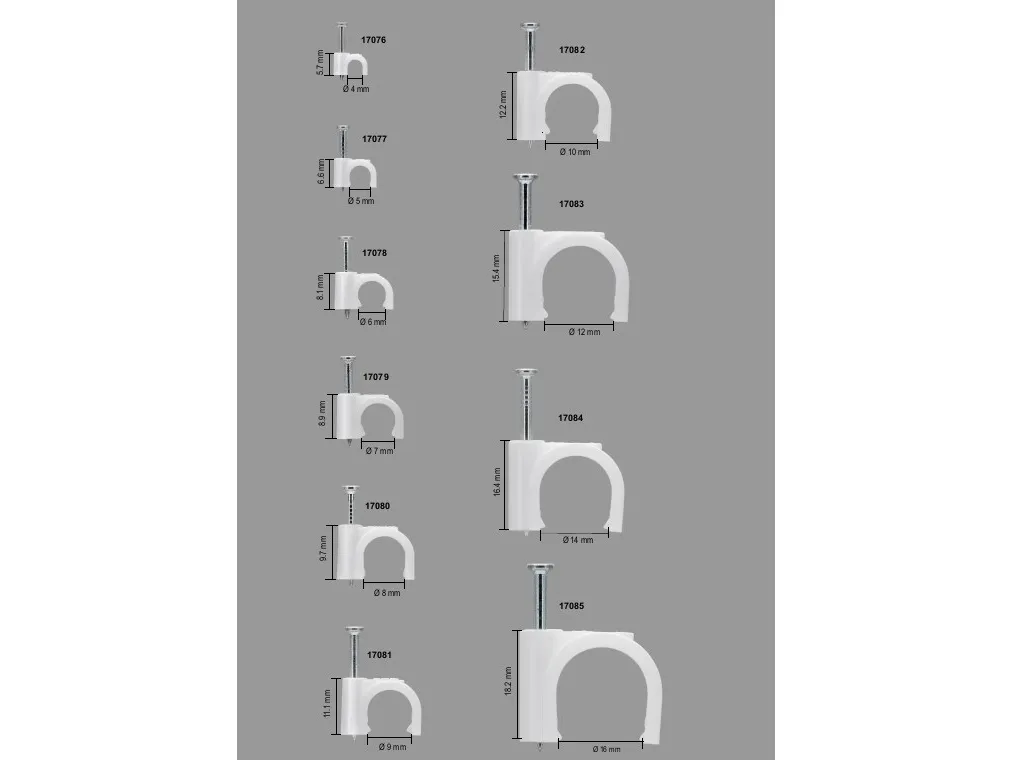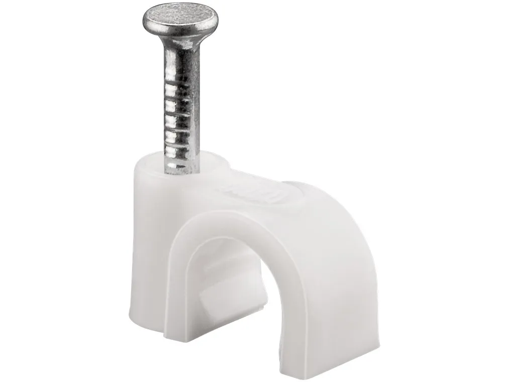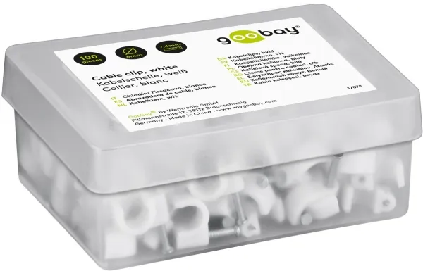 High-quality stabilised PE plastic and galvanised steel nails. You may use the cable clips with nail indoors and outdoors and achieve good insulation, corrosion resistance and aging resistance.Goobay Cable Clip 6 mm, white. Maximum bundle diameter: 6 mm, Product colour: White, Material: Polyethylene (PE). Height: 8.1 mm. Quantity per pack: 100 pc(s)