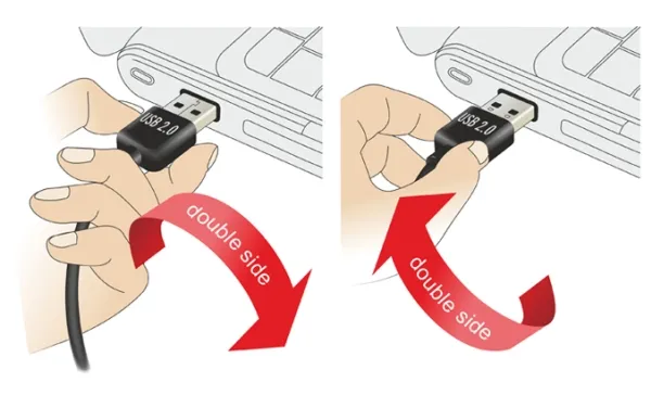 This cable by Delock with EASY-USB male can be plugged into the USB A female port in both directions. Thus the male port can be used both-sided and make the plug in easily.