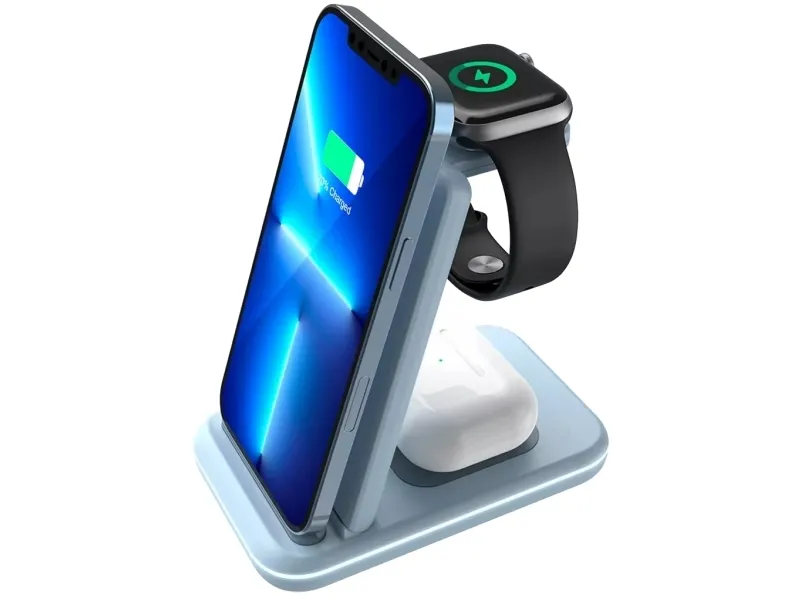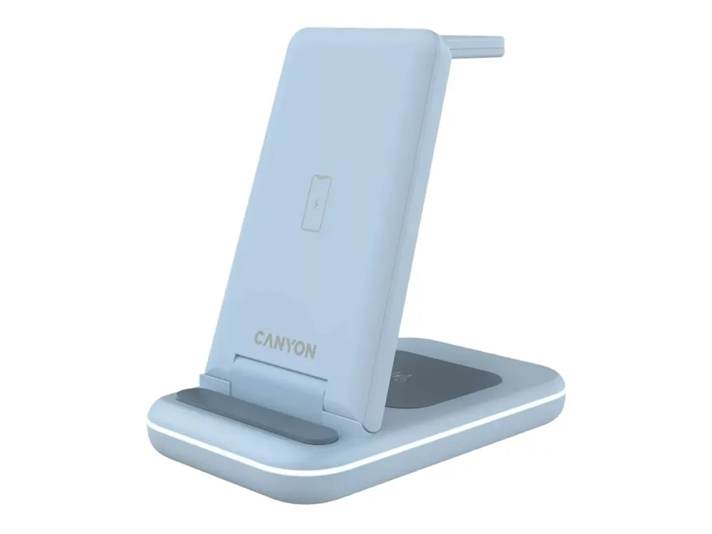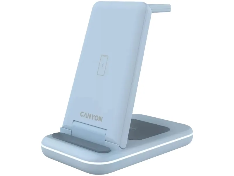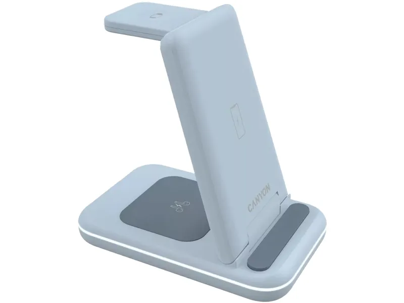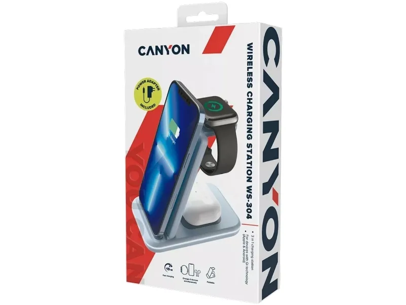 The Canyon WS-304 wireless charging stand is designed to efficiently charge multiple devices. With its 3-in-1 capability, it can power your phone, smart watch, and wireless earphones simultaneously, making it a useful charging station for daily use. Constructed from durable ABS plastic, this stand ensures longevity while remaining sleek and compact for easy transportation. The integrated Smart IC chip and various safety features, such as overvoltage protection, overcurrent protection, and foreign object detection, provide a reliable charging experience.