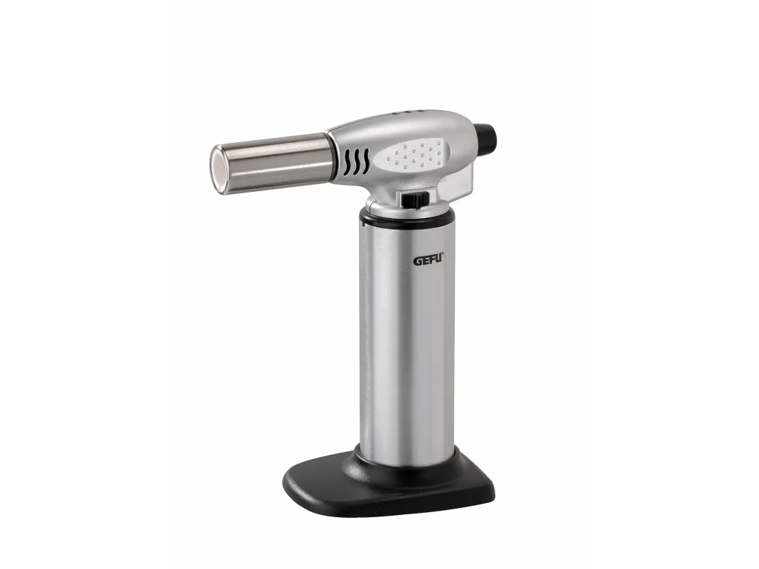The professional-quality kitchen torch for carmelising, browning, au gratin and crust toppings and peeling. With its flame temperature of up to 1,300 °C and very easy handling, you can put a crispy caramel layer on cream deserts, cakes and tarts, melt cheese on a delicious casserole, brown roasts and remove skin from tomatoes or peppers. As the size of the flame can be regulated, the appliance is suitable for a wide range of applications.GEFU FUEGO. Product colour: Black, Stainless steel, Housing material: Metal, Plastic. Width: 64 mm, Depth: 130 mm, Height: 178 mm