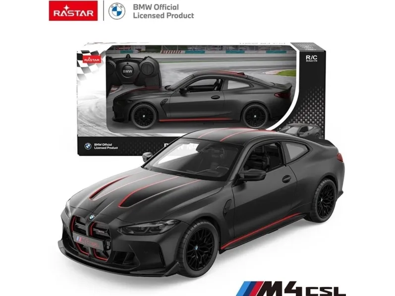 This matt black BMW M4 CSL has authentic car styling with injection moulded body and independent suspension system. The car drives forward, reverse, and turns left and right. Features head lights and transparent window. From 6 years. - size: 30 x 13 x 8.8 cm, scale 1:16 - frequency: 2.4GHz - remote control requires 2 x AA batteries (not included) - car requires 4 x AA batteries (not included) - speed: up to 7 KMH - range: up to 10-15 metres