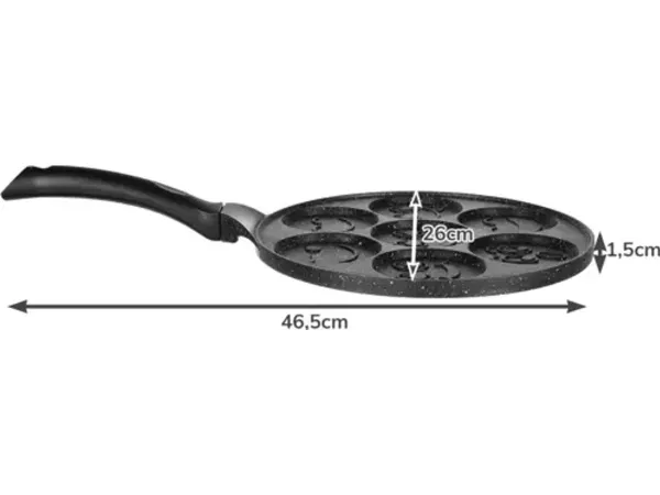 SPECIFIKATION - Materiale: Aluminium; Belægning: Maling; Sort, størrelse på en kage: 6,5 cm; Pandestørrelse: 26 cm; Vægt: 1.096 kg; Vægt i pakke: 1.196 kg.