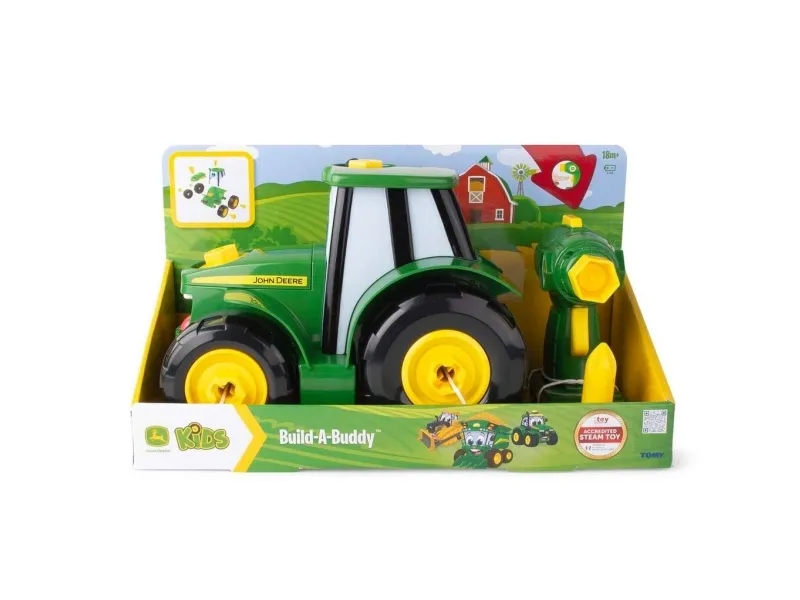 The award winning John Deere Build-A-Buddy Johnny Tractor features two great ways to play! Put together, Johnny is a great push along toy for lots of on-the-floor fun. But the fun doesn't stop there. This construction toy comes with a drill and two bits that lets kids take Johnny apart and put him back together again. Made of chunky parts, he's easy for little hands to assemble and comes with 2 AA batteries pre-installed so that the fun can start right away! Build-A-Buddy Johnny Tractor has received both STEAM Accreditation by the Toy Association and a Good Toy Guide Recommendation.