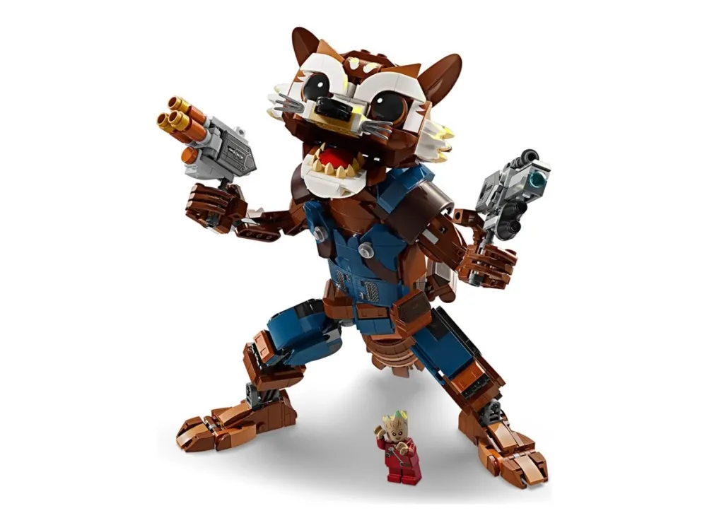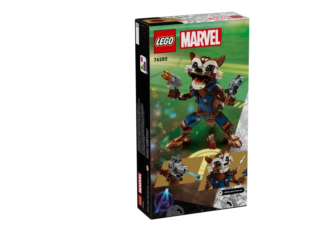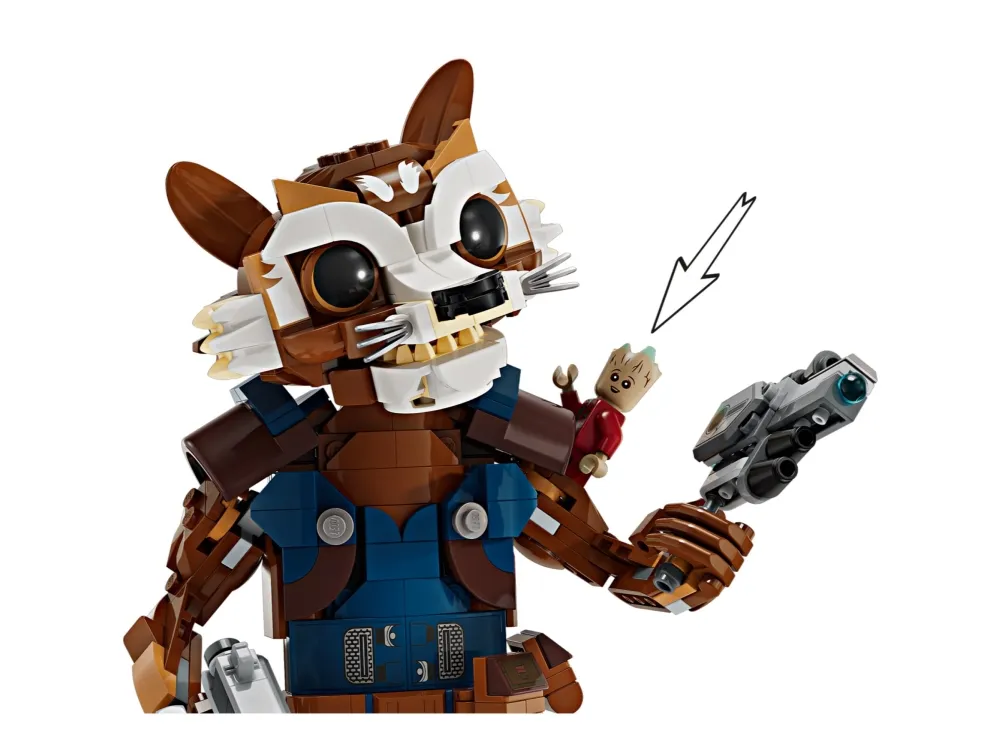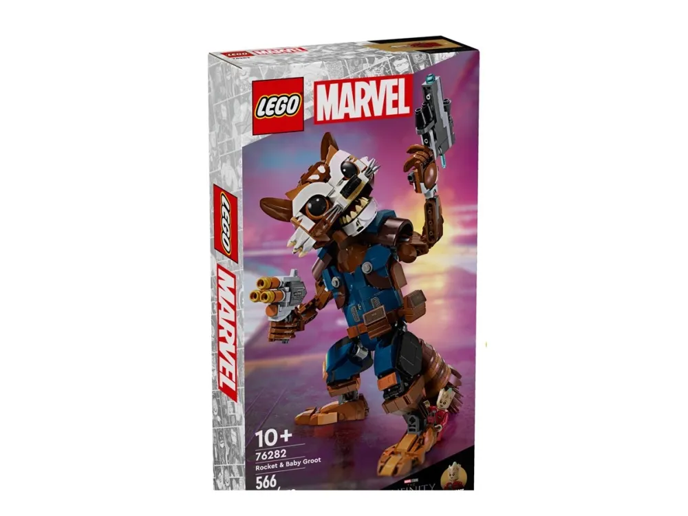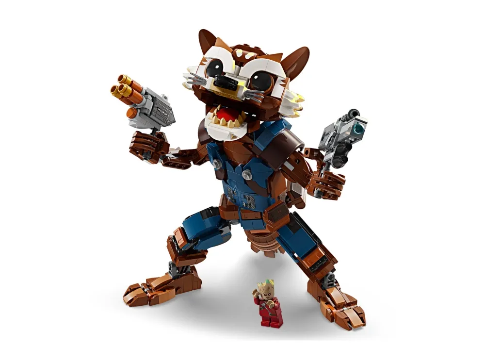 2 Marvel-hahmoa – Rakennuslelu sisältää 2 Guardians of the Galaxy ‑hahmoa: Rocketin jousiaseineen ja sädepyssyineen sekä Rocketin olkapäällä nököttävän Baby Grootin minihahmon