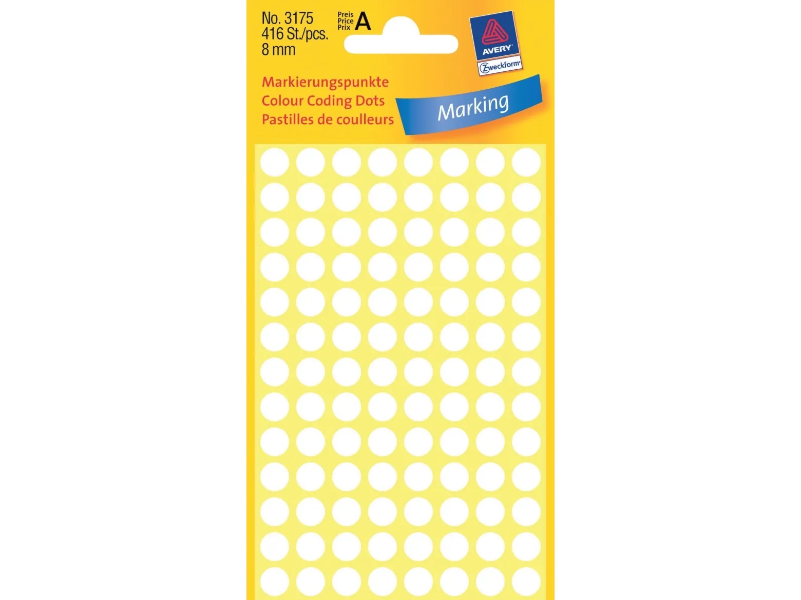 Avery 3175, Valkoinen, Ympyrä, Kiinteä, Paperi, 8 mm, 416 kpl